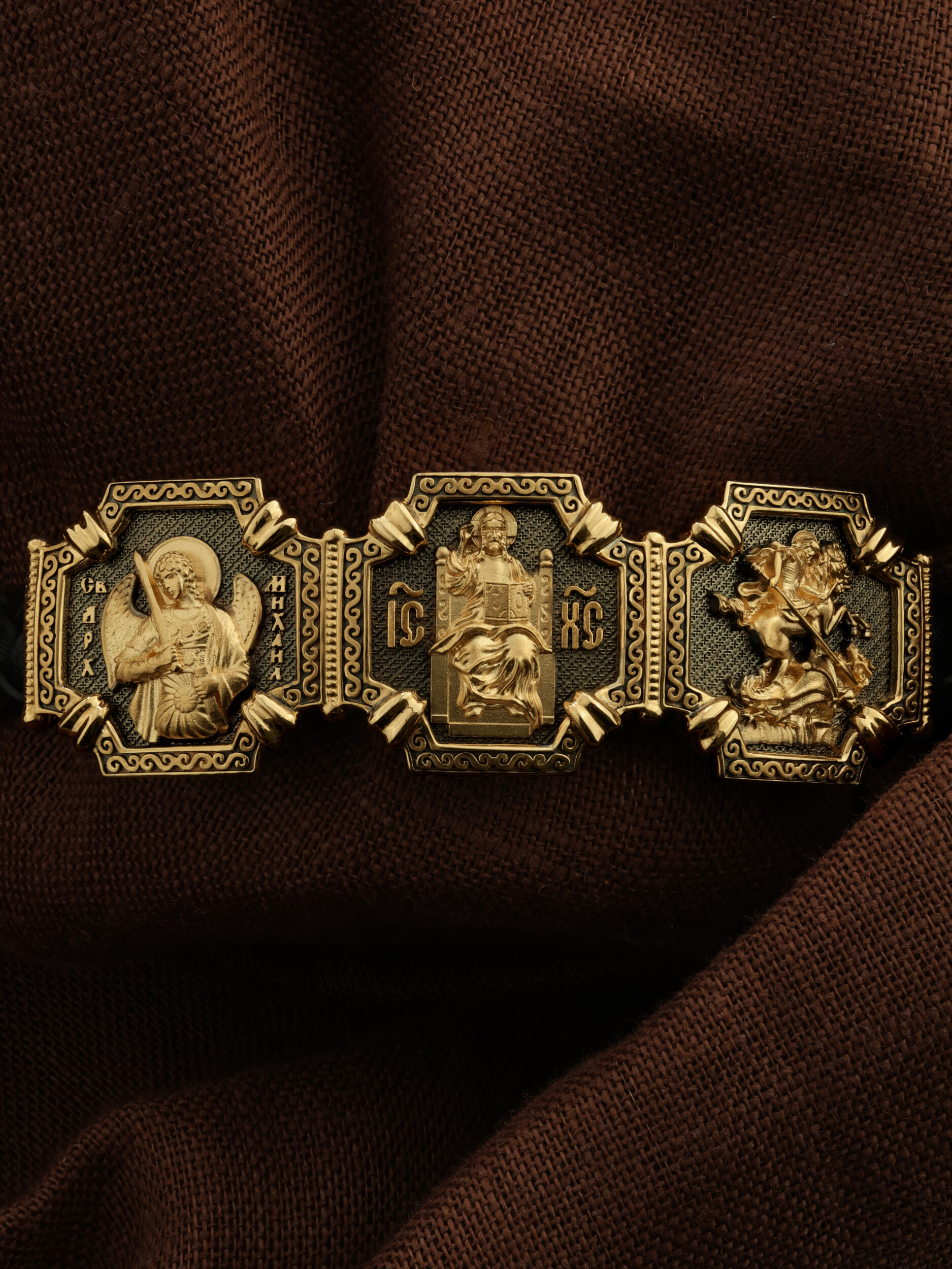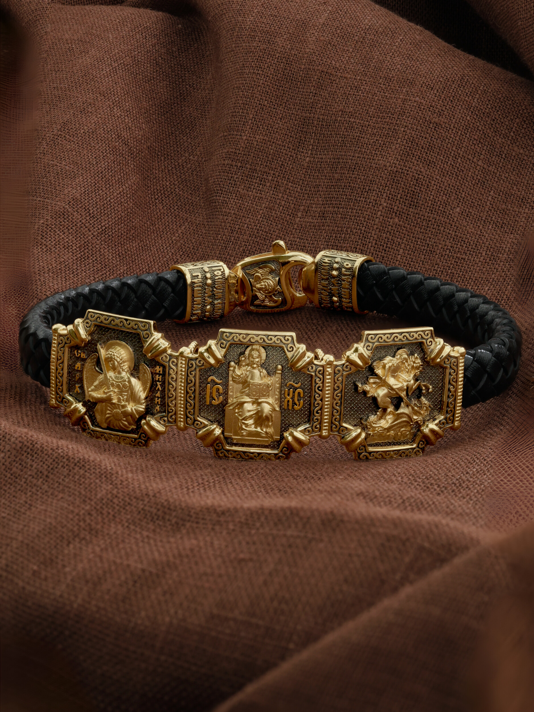 Композиционным центром браслета является Иисус Христос в образе Вседержителя, по-гречески «Пантократор». Это древнейший образ Спасителя, на котором Он представлен как властелин и правитель мира. Христос держит в руках Книгу, которая символизирует Книгу Бытия, то есть весь сотворенный Богом мир. В этой Книге судьбы всех людей, живущих на земле. Слева от образа Вседержителя — икона Архангела Михаила — Архистратига всех Небесных Воинств. Он ведет непримиримую войну против сил зла, охраняет райские врата и защищает души людей. Его имя означает «Кто яко Бог?», так как он самый могучий и грозный враг зла. Он первым ополчился на Денницу, когда тот восстал против Бога, низверг его с Неба и не перестает сражаться с его темным воинством. Поэтому он часто изображается в виде воина, в доспехах и с огненным мечом. Справа от образа Вседержителя — Великомученик Георгий Победоносец. Образ Великомученика считают одним из наиболее чтимых святынь в Святыни Православных, он олицетворяет собой заступника для верующих, чья жизнь имеет какое-либо отношение к военным делам, также он может оберегать и землевладельцев. Одно из самых великих чудес которое сотворил Великомученик так это — спасения всего города от устрашающего змия. Молитвами и своей непреклонной верой, взываемой к Всевышнему, он смог одолеть чудовище. Святой убил змея, спас жителей и их души от влияния дьявола, породив в них надежду и веру в Господа, призывая людей принять христианскую веру. Поскольку при жизни Святой Георгий был военным, он считается покровителем всех, кто имеет отношение к армии — военнослужащим, участникам боевых действий. Молитва перед иконой Георгия Победоносца поможет защититься от врагов, одержать победу в сражении (военном, спортивном, духовной брани с дьяволом), содействие в установлении мир