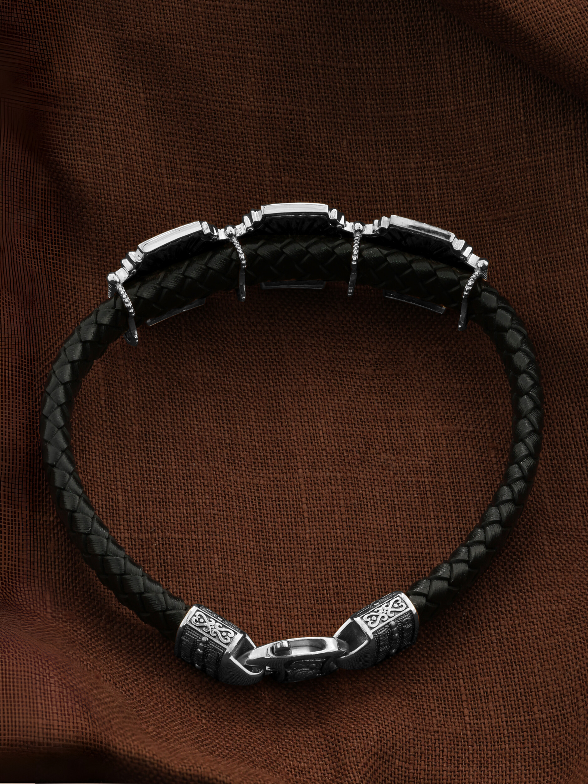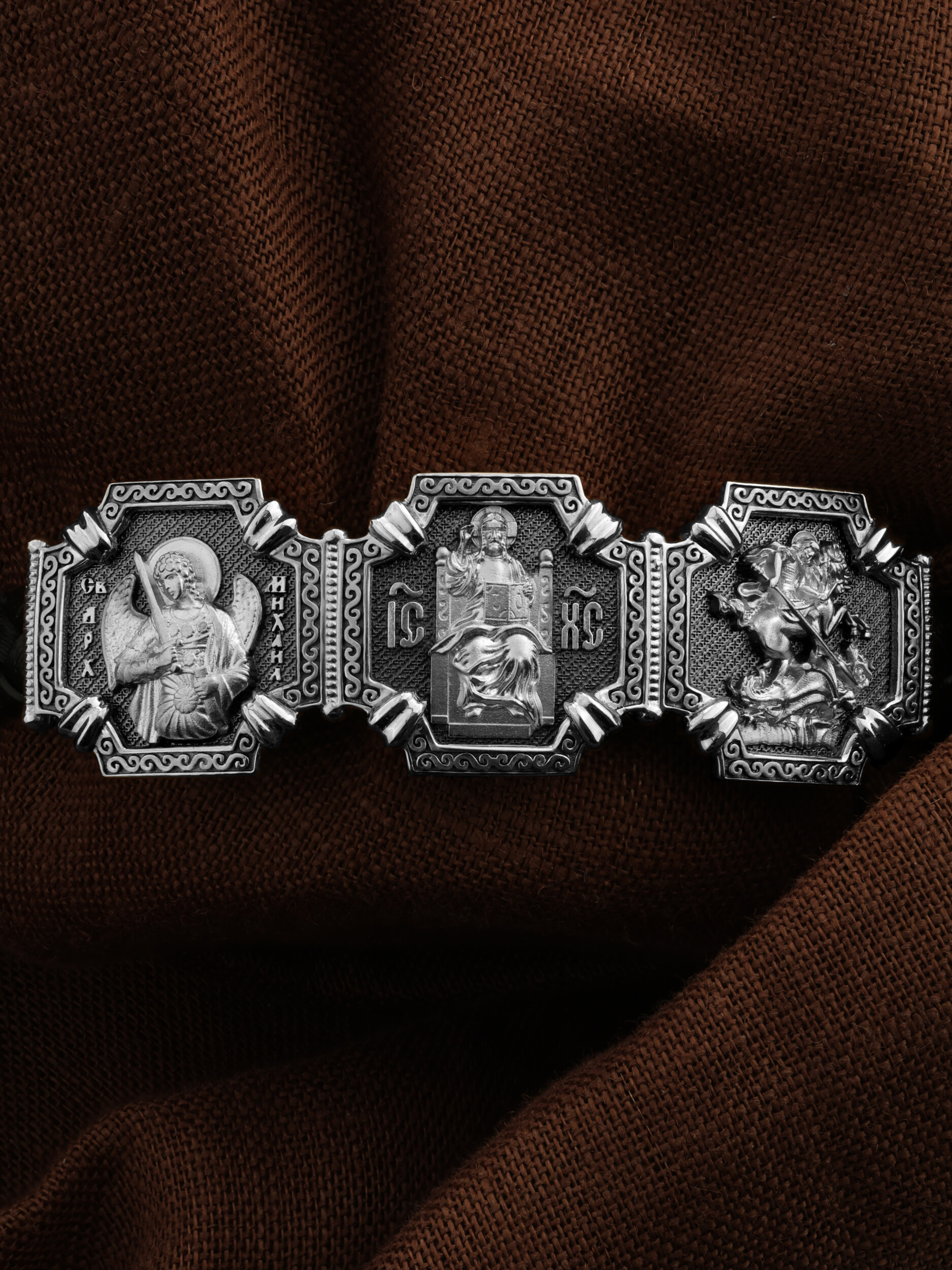 Композиционным центром браслета является Иисус Христос в образе Вседержителя, по-гречески «Пантократор». Это древнейший образ Спасителя, на котором Он представлен как властелин и правитель мира. Христос держит в руках Книгу, которая символизирует Книгу Бытия, то есть весь сотворенный Богом мир. В этой Книге судьбы всех людей, живущих на земле. Слева от образа Вседержителя — икона Архангела Михаила — Архистратига всех Небесных Воинств. Он ведет непримиримую войну против сил зла, охраняет райские врата и защищает души людей. Его имя означает «Кто яко Бог?», так как он самый могучий и грозный враг зла. Он первым ополчился на Денницу, когда тот восстал против Бога, низверг его с Неба и не перестает сражаться с его темным воинством. Поэтому он часто изображается в виде воина, в доспехах и с огненным мечом. Справа от образа Вседержителя — Великомученик Георгий Победоносец. Образ Великомученика считают одним из наиболее чтимых святынь в Святыни Православных, он олицетворяет собой заступника для верующих, чья жизнь имеет какое-либо отношение к военным делам, также он может оберегать и землевладельцев. Одно из самых великих чудес которое сотворил Великомученик так это — спасения всего города от устрашающего змия. Молитвами и своей непреклонной верой, взываемой к Всевышнему, он смог одолеть чудовище. Святой убил змея, спас жителей и их души от влияния дьявола, породив в них надежду и веру в Господа, призывая людей принять христианскую веру. Поскольку при жизни Святой Георгий был военным, он считается покровителем всех, кто имеет отношение к армии — военнослужащим, участникам боевых действий. Молитва перед иконой Георгия Победоносца поможет защититься от врагов, одержать победу в сражении (военном, спортивном, духовной брани с дьяволом), содействие в установлении мир
