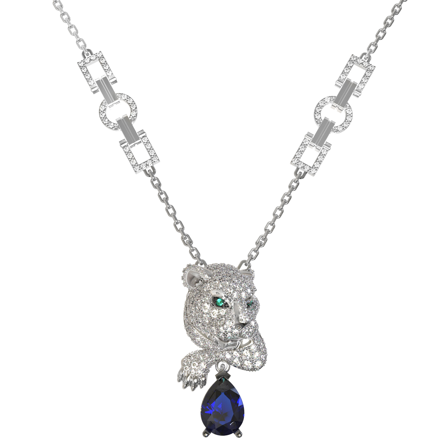 Колье из белого золота c бриллиантами, сапфиром и изумрудом