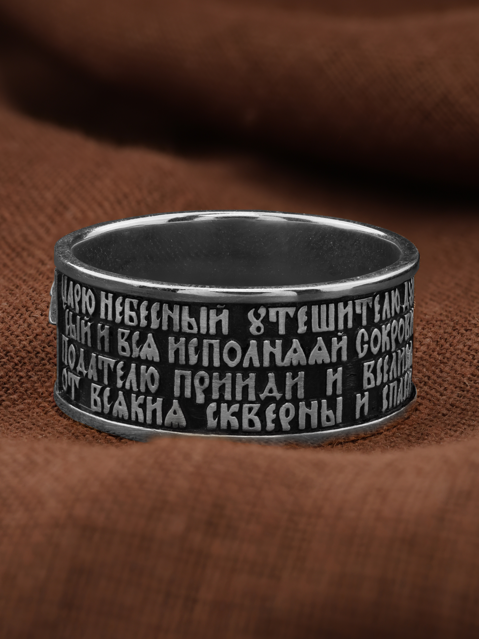 На лицевой стороне кольца изображен Святой Дух в виде голубя и помещена молитва Святому Духу: «Царю Небесный, Утешителю, Душе истины, Иже везде сый и вся исполняяй, Сокровище благих и жизни Подателю, прииди и вселися в ны, и очисти ны от всякия скверны, и спаси, Блаже, души наша».