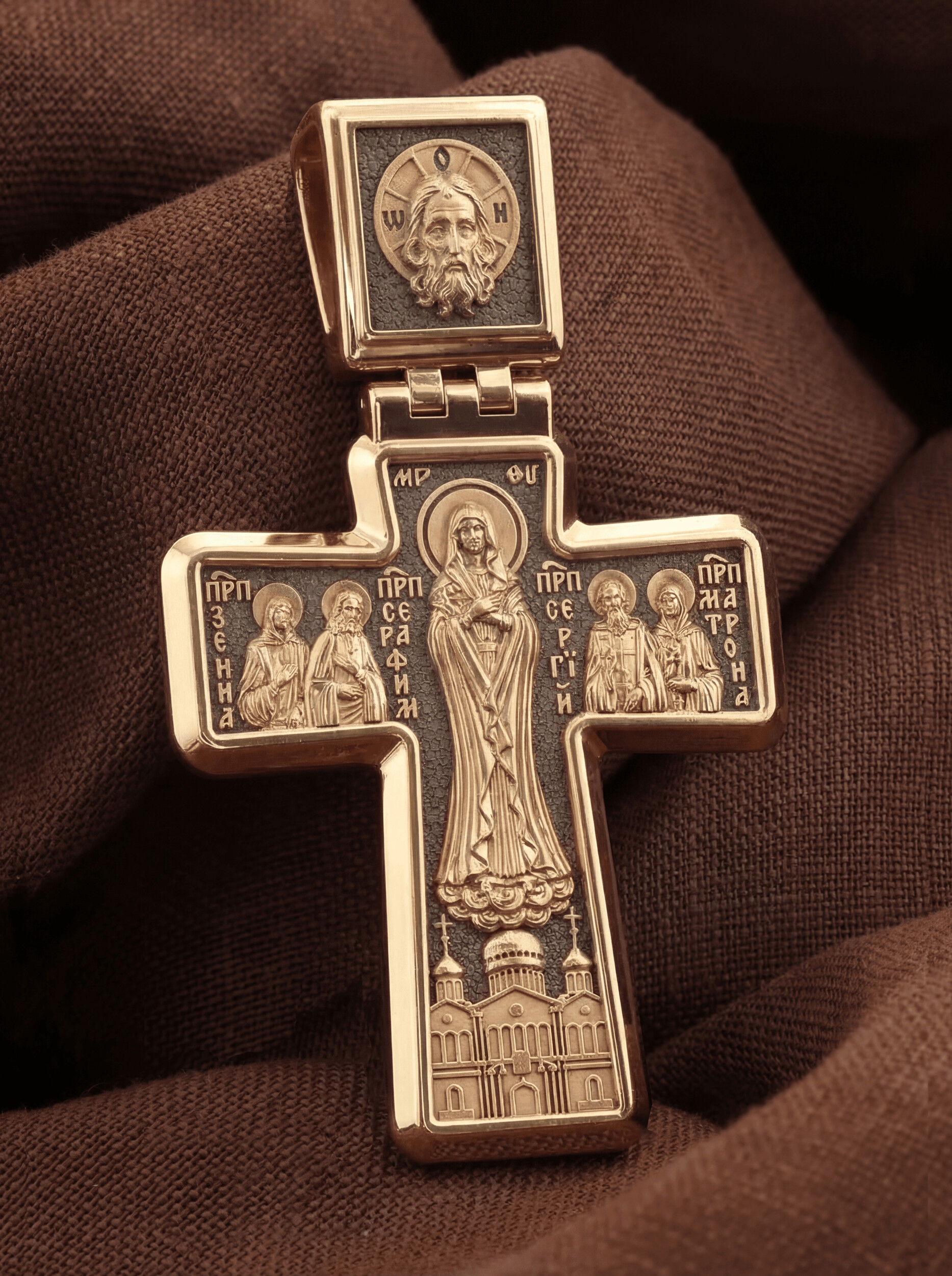 На лицевой стороне креста изображено Распятие Иисуса Христа. Позади Его изображена иерусалимская стена, знак того, что Господь был распят вне стен города. Но вместе с тем стена знаменует и Небесный Иерусалим, путь в который открылся для человечества через Голгофу: «МЛРБ», «Место Лобное Рай Бысть» — написано у ее основания. Рядом с Его образом помещены слова «Царь Славы». Эти слова характеризуют Господа как Великого Архиерея, победителя смерти. Верхняя перекладина символизирует титло — табличку, на которой, согласно Евангелию, было начертано: «Иисус Назорей Царь Иудейский» (IНЦI). Также Распятие сопровождается надписями, олицетворяющими Христа. Это святое имя Христа «IC» (Иисус) «ХС» (Христос), и словосочетание «Сын Божий», а так же написан тропарь Животворящему Кресту: «Кресту Твоему поклоняемся, Владыко, и святое воскресение Твое славим». Распятие стоит на горе камней, символизирующих Голгофу, в основании которой различается череп. Это голова Адама. На кулонном кольце помещено изображение Святой Троицы.