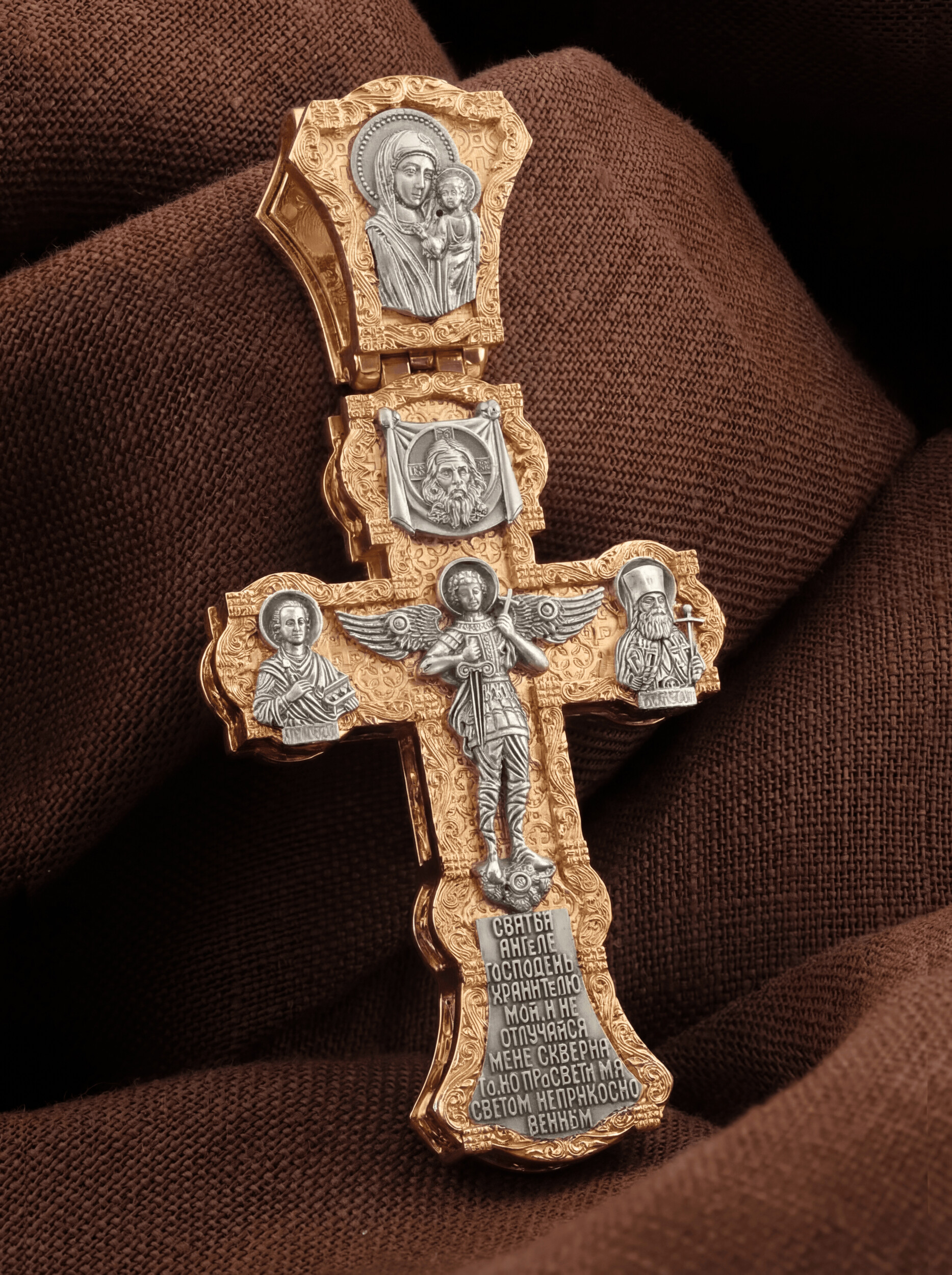 В центральной части оборотной стороны креста изображен Святой Ангел-Хранитель в виде прекрасного юноши держащего в правой руке меч, а в левой — крест. Ангел-Хранитель — это Ангел приставляемый Богом к человеку при крещении для охраны и помощи в добрых делах. Невидимо пребывая при нас постоянно, он наставляет нас на все доброе и полезное, охраняют и защищают нас от врагов видимых и невидимых, ходатайствует за нас пред Богом. Ниже образа помещена молитва: «Святый Ангел Господень Хранитель мой, и не отлучайся от Меня скверного, но просвети меня светом неприкосновенным.» Выше образа изображен Спас Нерукотворный — образ Господа и Спасителя нашего Иисуса Христа, чудесно отпечатавшийся на плате, котором Христос вытер свой лик. Слева — Святой великомученик и целитель Пантелеи¬мон. Господь даровал удивительную силу его молитве. Ею он исцелял любые болезни, воскрешал мертвых. Справа помещен образ Святителя Луки (Войно-Ясенецкого), русского святителя, исповедника, духовного писателя, доктора богословия, а также выдающегося ученого. На кулонном кольце изображена Казанская икона Божией Матери — одна из самых любимых на Руси.