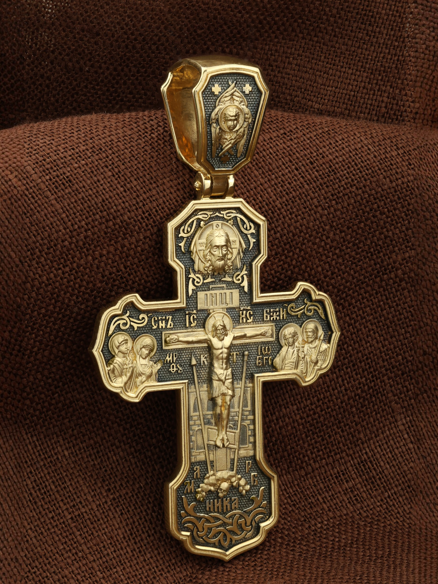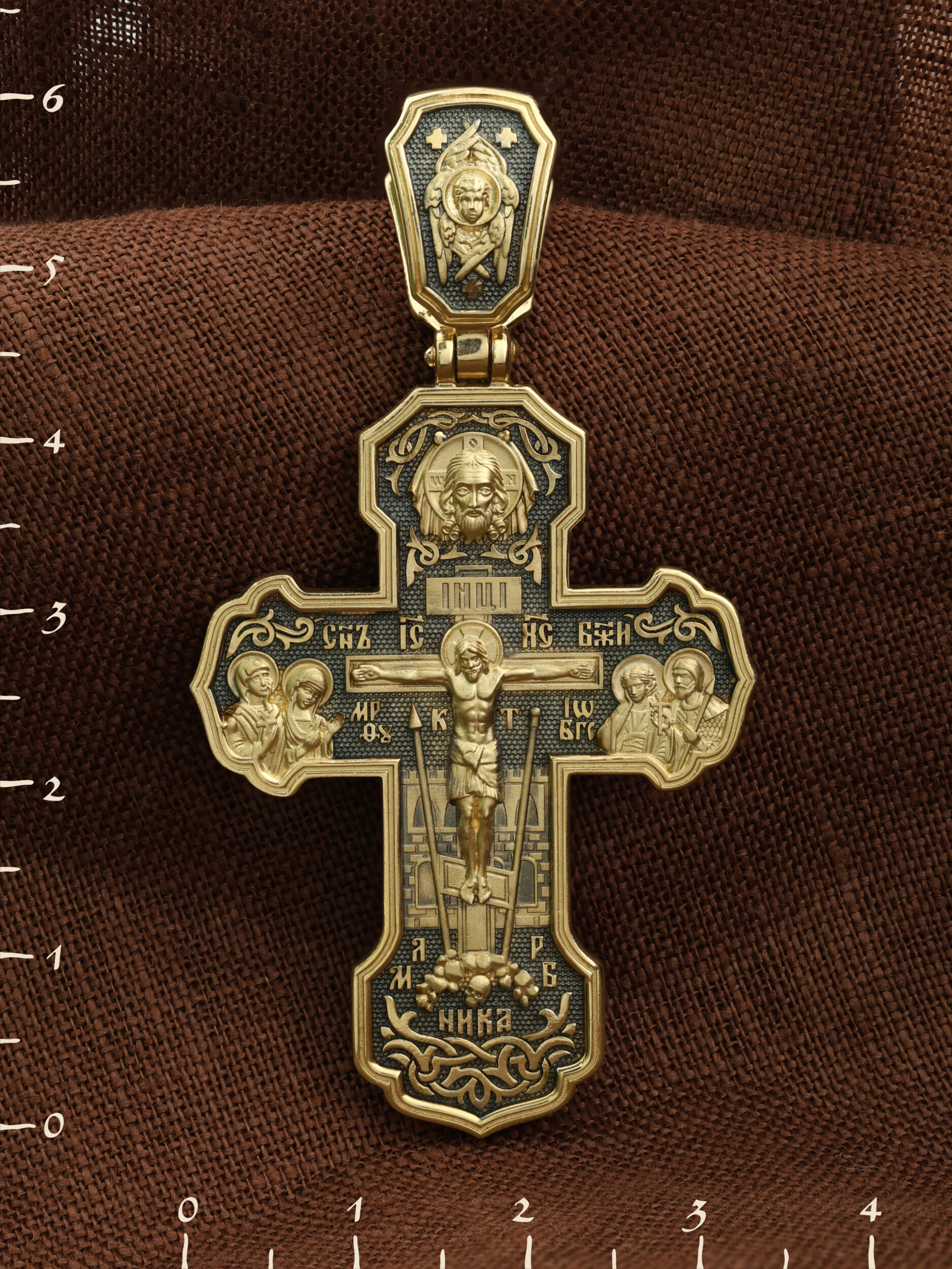 На лицевой стороне креста изображено Распятие Господа и Спасителя нашего Иисуса Христа. Крест- символ спасения и искупления рода человеческого, знамение победы над смертью и адом. Иисус Христос, как искупительная жертва освобождения человечества от власти греха, умер крестной смертью и в третий день воскрес. На верхней табличке, выше головы Иисуса, расположена надпись, составленная Понтием Пилатом — «IНЦI». Она означает «Иисус Назорей, Царь Иудейский». Надпись «IС» « ХС» означает Иисус Христос и помещается на разных сторонах поперечной (большой) перекладины креста. Рядом расположена надпись «Сын Божий». Выше Распятия изображен Нерукотворный образ Господа и Спасителя нашего Иисуса Христа. Слева от Распятия — Пресвятая Богородица и святая мироносица Мария Магдалина с крестом в руке. Справа — апостол и евангелист Иоанн Богослов, один из ближайших учеников Иисуса Христа и сотник Лонгин с крестом в правой руке и копьем — в левой. За крестом высится Иерусалимская стена. Крест стоит на горе камней, символизирующих Голгофу. В ее основании различается череп — это голова Адама. Вдоль креста изображены копие сотника Лонгина и трость с губкой и буквы «К» и «Т». Надпись «МЛРБ» — «место лобное рай бысть» означает, что место лобное стало раем и помещаются в нижней части креста. Рядом — слово «НИКА», что означает «победитель». На православном кресте Христос не умирает, а свободно простирает руки, ладони Иисуса открыты, будто он хочет обнять все человечество, даря им свою любовь и открывая путь к вечной жизни. На кулонном кольце изображен шестикрылый Серафим.