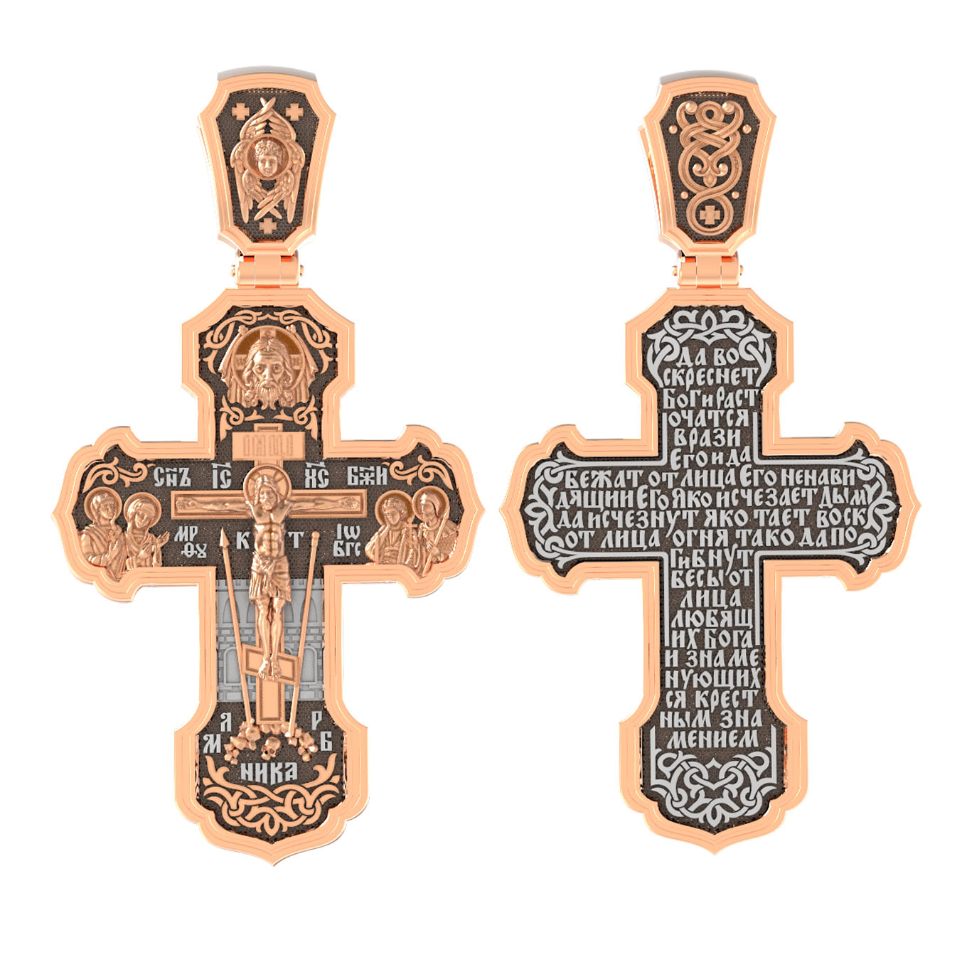 На лицевой стороне креста изображено Распятие Господа и Спасителя нашего Иисуса Христа. Крест- символ спасения и искупления рода человеческого, знамение победы над смертью и адом. Иисус Христос, как искупительная жертва освобождения человечества от власти греха, умер крестной смертью и в третий день воскрес. На верхней табличке, выше головы Иисуса, расположена надпись, составленная Понтием Пилатом — «IНЦI». Она означает «Иисус Назорей, Царь Иудейский». Надпись «IС» « ХС» означает Иисус Христос и помещается на разных сторонах поперечной (большой) перекладины креста. Рядом расположена надпись «Сын Божий». Выше Распятия изображен Нерукотворный образ Господа и Спасителя нашего Иисуса Христа. Слева от Распятия — Пресвятая Богородица и святая мироносица Мария Магдалина с крестом в руке. Справа — апостол и евангелист Иоанн Богослов, один из ближайших учеников Иисуса Христа и сотник Лонгин с крестом в правой руке и копьем — в левой. За крестом высится Иерусалимская стена. Крест стоит на горе камней, символизирующих Голгофу. В ее основании различается череп — это голова Адама. Вдоль креста изображены копие сотника Лонгина и трость с губкой и буквы «К» и «Т». Надпись «МЛРБ» — «место лобное рай бысть» означает, что место лобное стало раем и помещаются в нижней части креста. Рядом — слово «НИКА», что означает «победитель». На православном кресте Христос не умирает, а свободно простирает руки, ладони Иисуса открыты, будто он хочет обнять все человечество, даря им свою любовь и открывая путь к вечной жизни. На кулонном кольце изображен шестикрылый Серафим.
