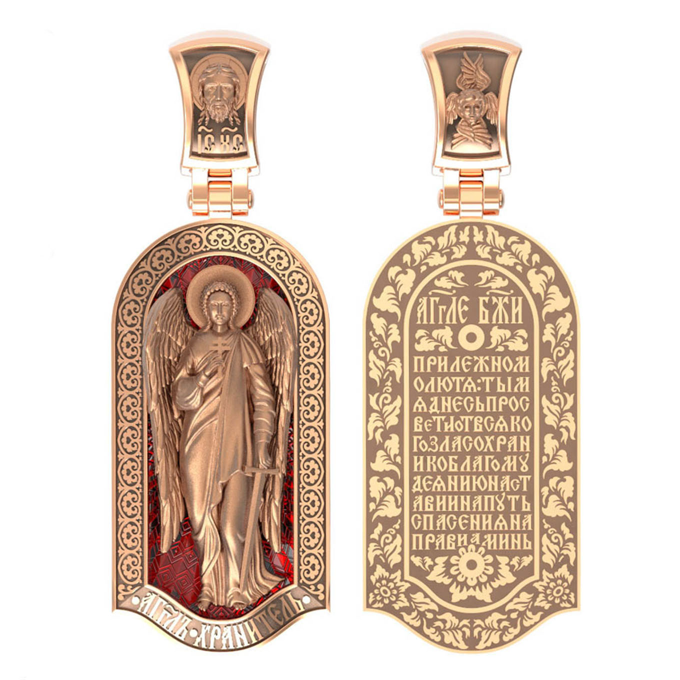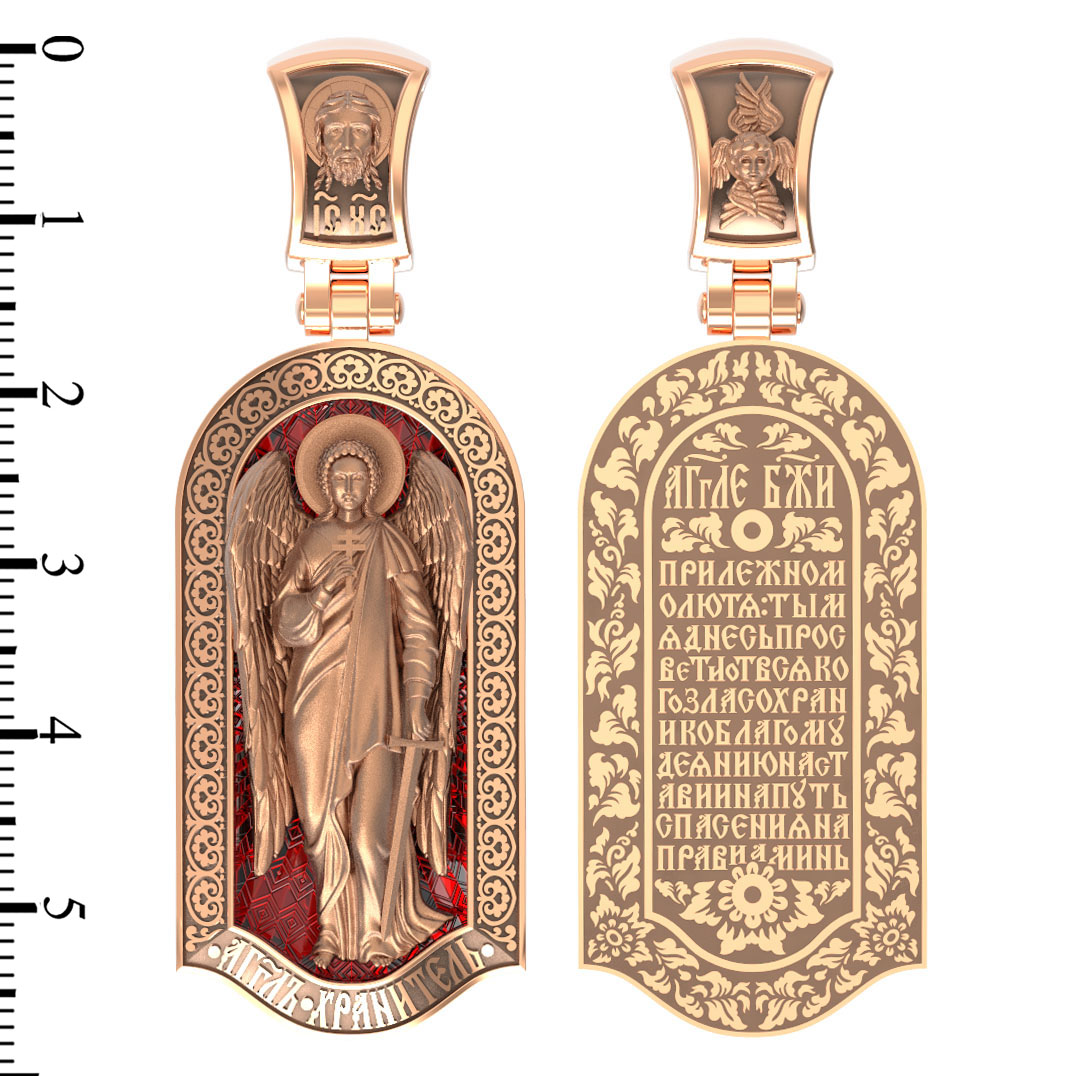 Основой композиции лицевой стороны является Ангела Хранителя. Образок Ангел Хранитель — это не просто украшение, а настоящая миниатюрная икона. В руках Ангел держит традиционные символические атрибуты Ангелов Хранителей: крест — знак послушания Христу и следования Его заповедям, меч — символ непримиримой борьбы, которую он ведет с бесами, отражая их нападения на людей. Слово «ангел» означает «вестник». Ангелы — верные служители Божьи, которых Господь посылает возвещать Свои повеления. Ангелы тварны, как и люди, но имеют другую природу. На иконах они изображаются в человеческом обличье с большими крыльями. Могучие крылья ангелов символизируют быстроту, с которой они исполняют повеления Бога, а небольшие ленточки у ушей –тороки, или слухи — показывают, что они всегда слышат Его голос.