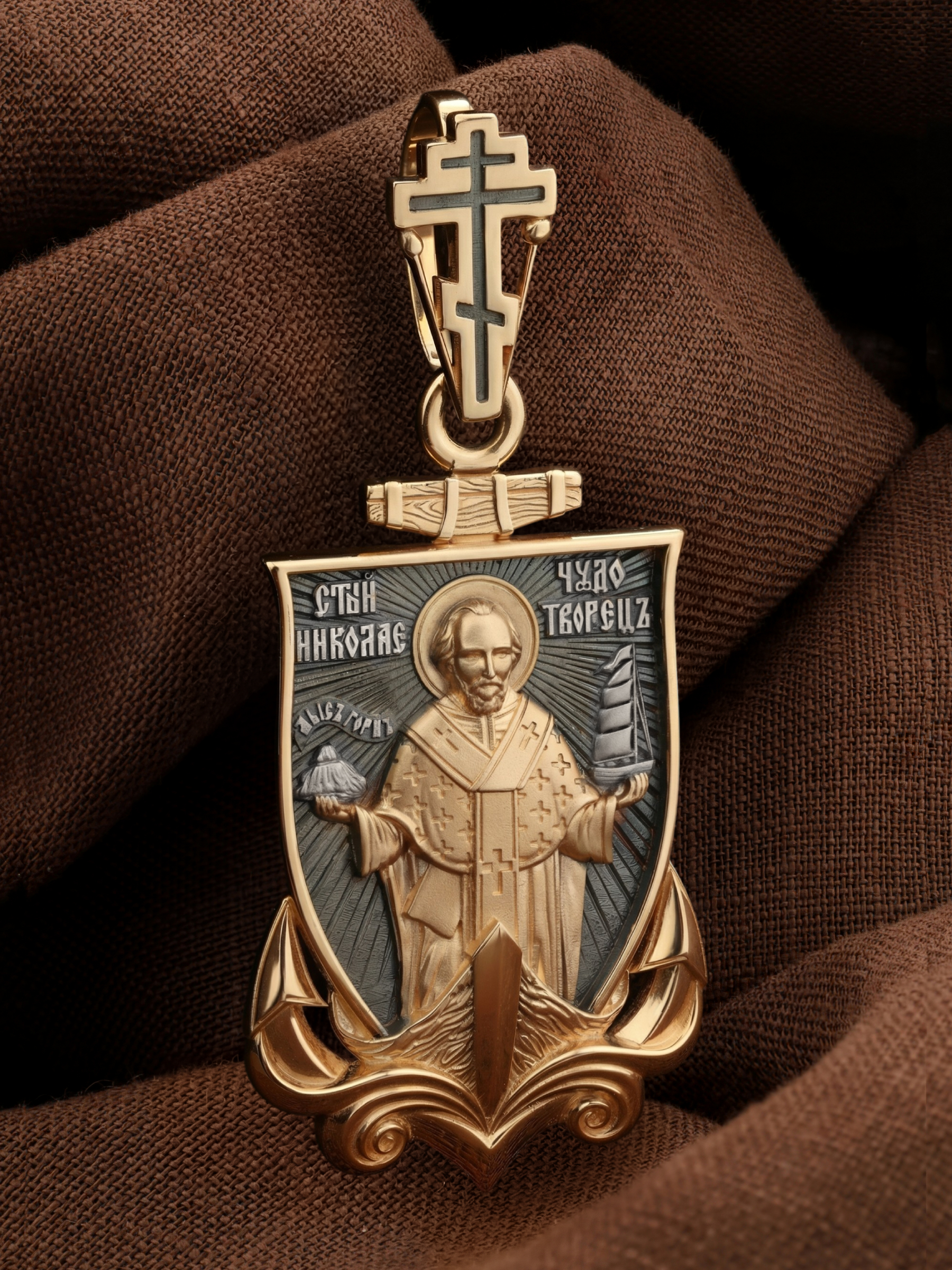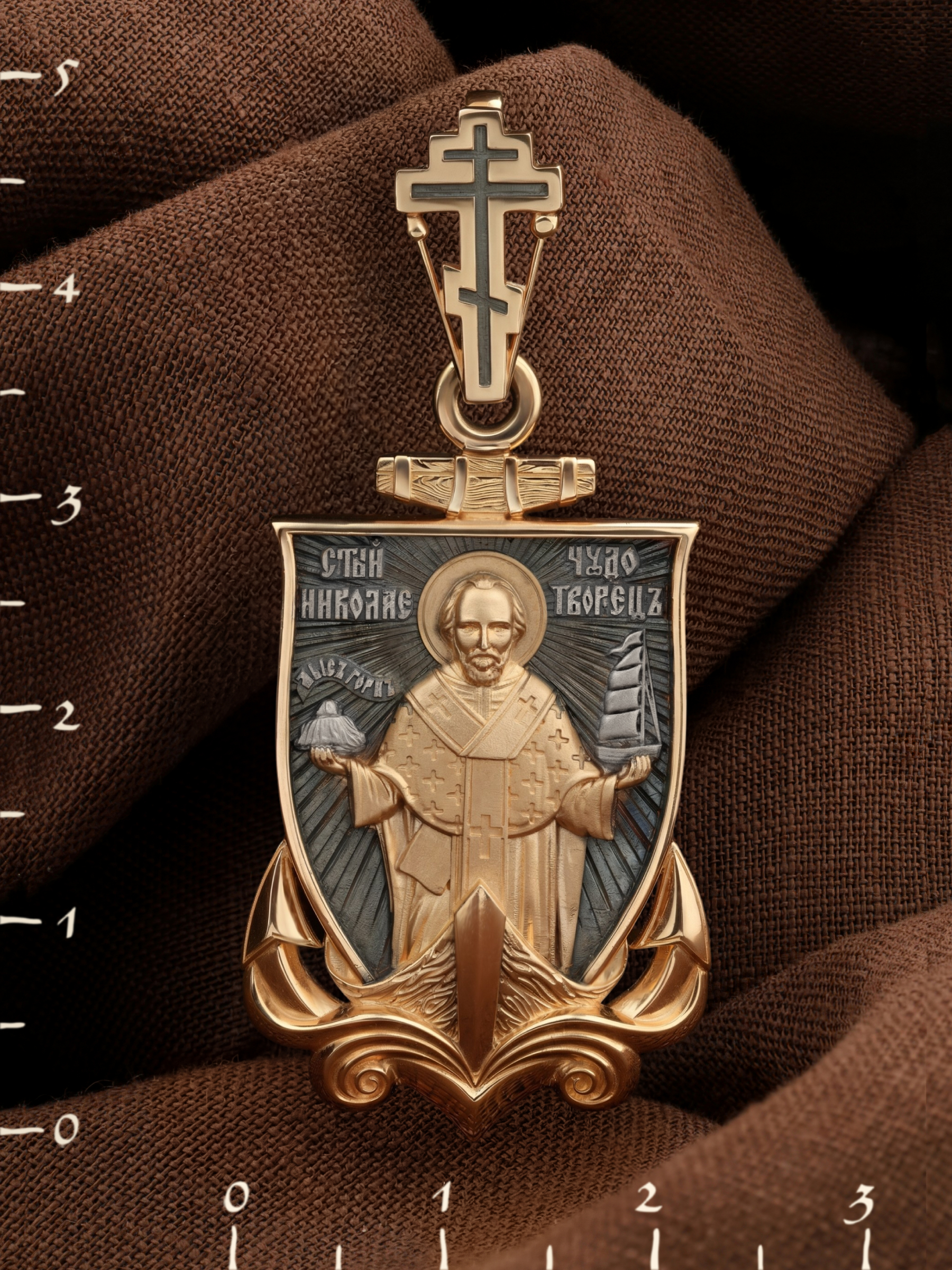 Лицевую сторону возглавляет икона Святителя Николая Чудотворца. Живший в III веке епископ Ликийского города Миры — самый почитаемый святой не только в России, но и во всем мире. Николай Чудотворец, помощник в делах, покровитель учащихся, утешитель обиженных и нуждающихся, целитель самых страшных и тяжелых недугов, предстатель и молитвенник за людей перед Богом. Также Святитель Николай Чудотворец известен своими молитвами за путешественников, когда непрестанный ветер и бушующие волны утихают и корабль заходит в спокойную гавань.