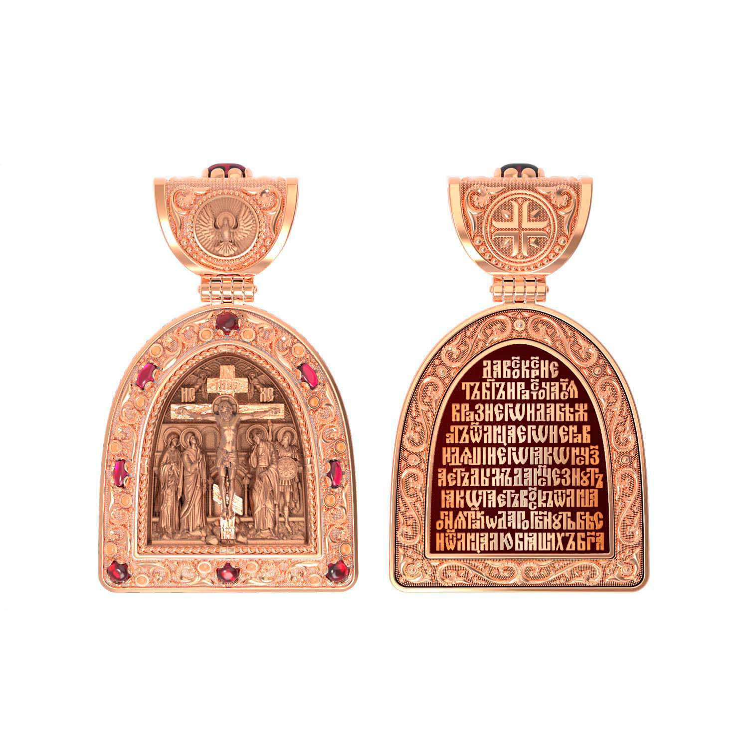 На лицевой стороне образка изображено Распятие Господа Иисуса Христа. Справа от Господа изображены Божия Матерь и святая Мария Клеопова, слева — святой апостол Иоанн и святой Лонгин Сотник. Все эти святые вместе с Богоматерью находлились на Голгофе при казни Спасителя.