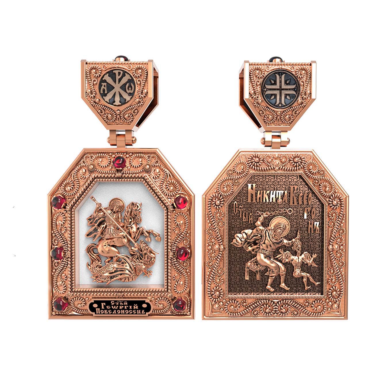 Основой композиции лицевой стороны образка является изображение Святого Великомученика Георгия Победоносца — одного из самых почитаемых и удивительных святых. На Руси он известен как Юрий или Егорий, покровитель воинов, помощник в крестьянском труде. На образке он изображен как воитель, сидящий на вздыбленном коне и поражающий копьем огнедышащего змея. Змей символизирует собою сатанинские силы. Молитвами вознесенными к Всевышнему и своей непреклонной верой он смог одолеть чудовище. Святой убил змея, спас царскую дочь, принесенную в жертву, и жителей города, их души от влияния дьявола, породив в них надежду и веру в Господа, призывая людей принять христианскую веру.