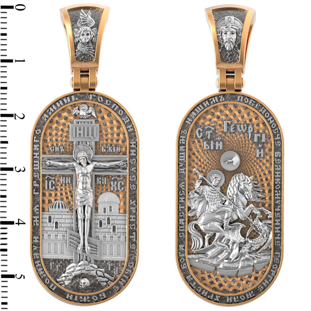 По контуру написана молитва: «Победоносче Великомучениче Георгие, моли Христа Бога спастися душам нашим». На кулонном кольце изображен Спас Нерукотворный — Символ вочеловечившегося Божества.