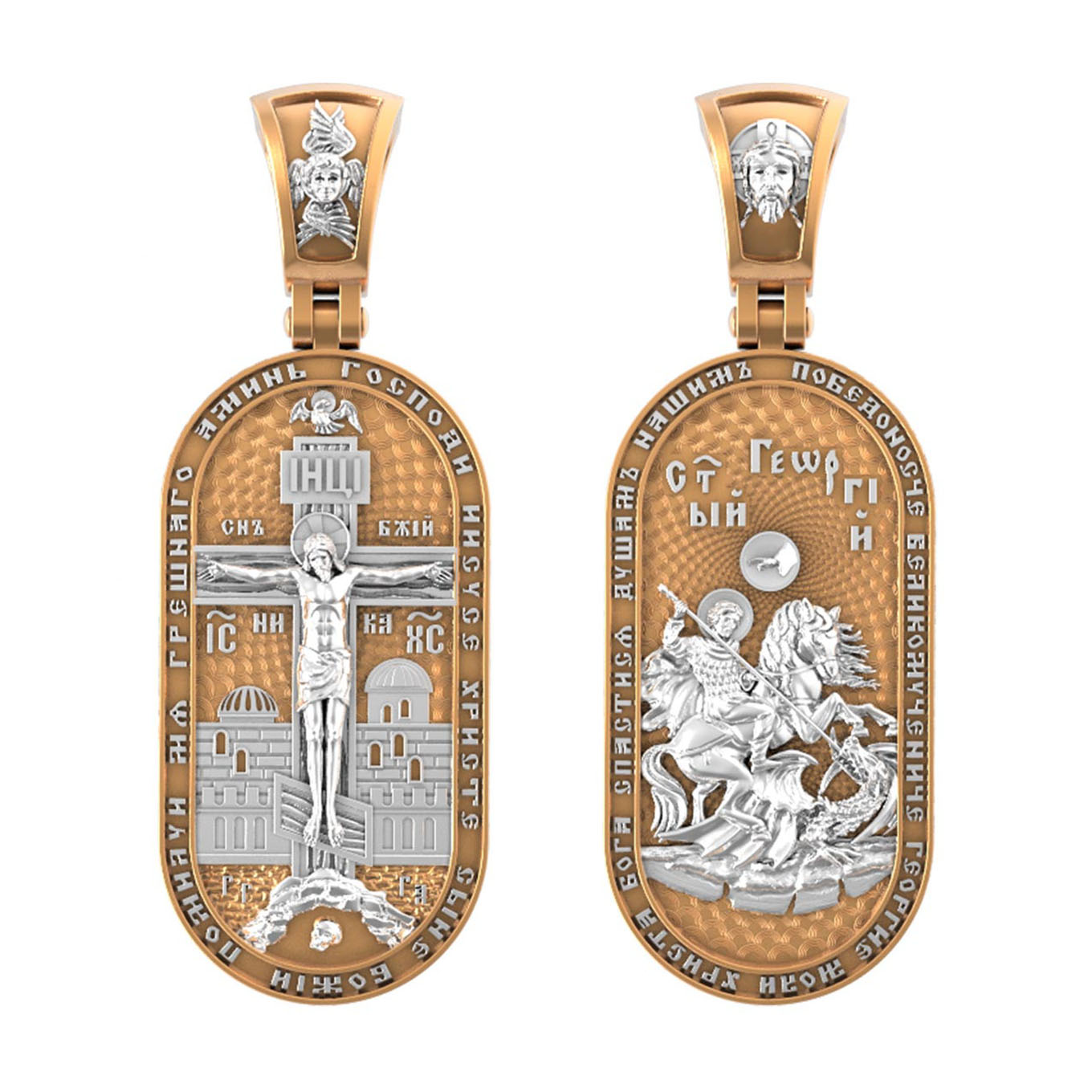 По контуру написана молитва: «Победоносче Великомучениче Георгие, моли Христа Бога спастися душам нашим». На кулонном кольце изображен Спас Нерукотворный — Символ вочеловечившегося Божества.