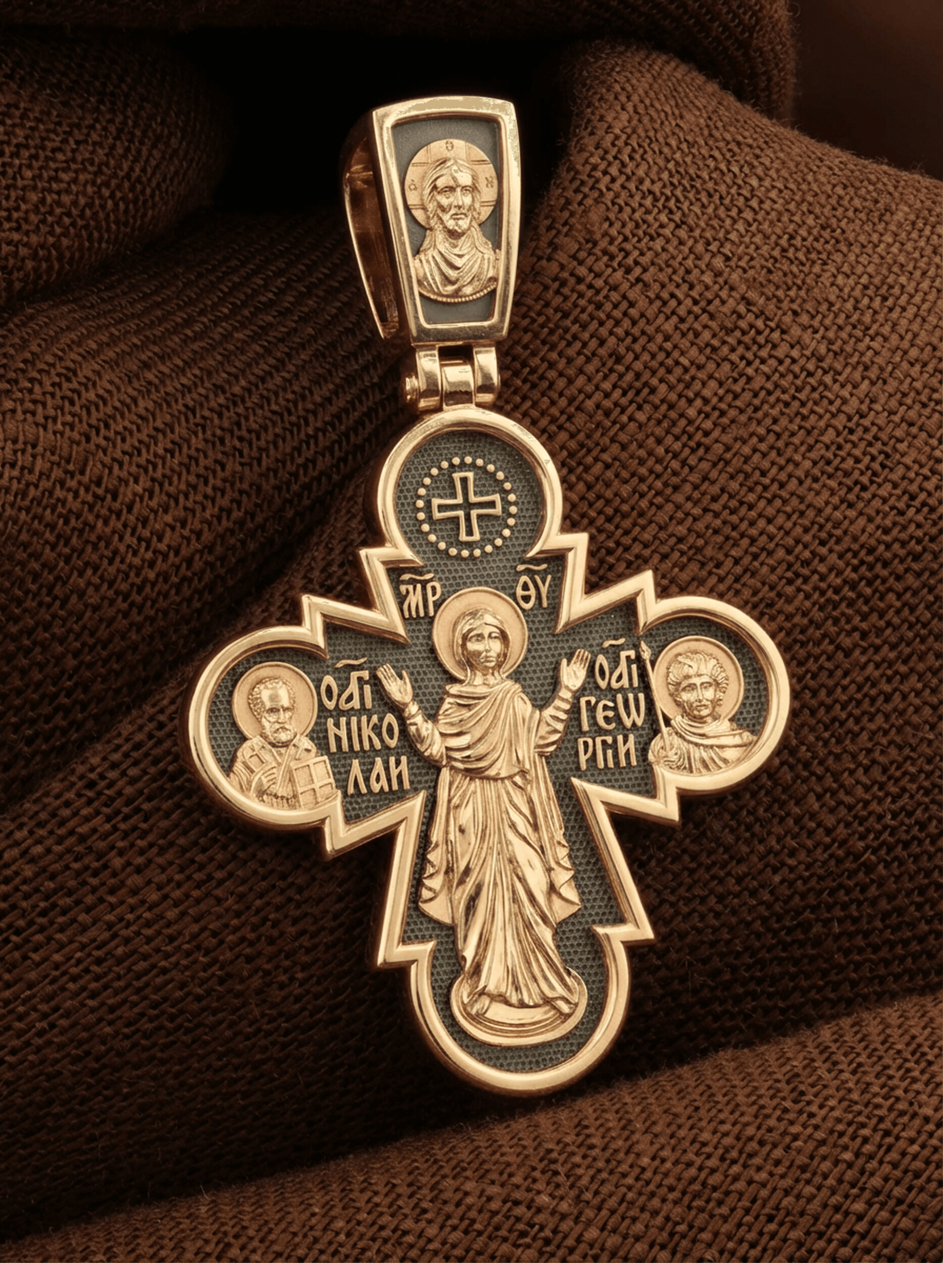 Центральную часть оборота креста занимает икона Божьей Матери «Нерушимая Стена». Особенно почитается эта икона как помощница в тяжелых жизненных ситуациях, как защитница от врагов и спасительница в смертельной опасности. Слева от Божьей Матери расположен образ Святого Николая Чудотворца. Ему молятся, отправляясь в путешествие, особенно по морю, просят исцеления в различных недугах, помощи в торговых делах, учебе и поисках достойного супруга. Справа — святой великомученик Георгий Победоносец († 303), один из наиболее почитаемых святых в Христианской Церкви. Покровитель воинов, помощник в крестьянском труде, защитник в бедах, духовный помощник в невидимой брани с силами зла. Святой Георгий, небесный защитник, который спускается с Небес, чтобы помочь душе избавиться от гибели.