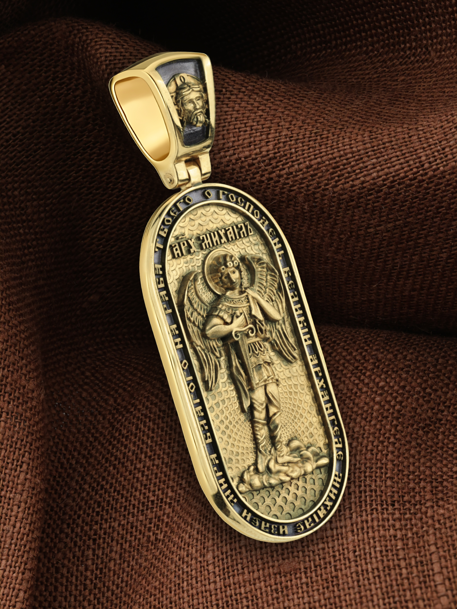 Основой композиции оборотной стороны является ростовое изображение Архангела Михаила — Архистратига всех Небесных Воинств. Он ведет непримиримую войну против сил зла, охраняет райские врата и защищает души людей. По контуру написана молитва: «О, Господень Великий Архангеле Михаиле, излей мира благого на раба Твоего». На кулонном кольце изображен Спас Нерукотворный — Символ вочеловечившегося Божества.