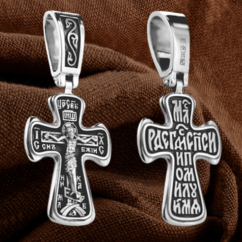 На лицевой стороне креста изображено Распятие, потому что это орудие казни Иисус Христос сделал орудием победы над грехом и смертью. Своими страданиями Он искупил грехи человечества, умерев и сошествовав во ад, победил сатану, освободил души праведников от вечной смерти и открыл им небесные врата рая. Жертва Христа сделала возможным спасение для каждого человека. На православном кресте Христос не умирает, а свободно простирает руки, ладони Иисуса открыты, будто он хочет обнять все человечество, даря им свою любовь и открывая путь к вечной жизни. Над титлом видим слова «ЦРЬ СЛВЫ» — Царь Славы. Верхняя перекладина символизирует собой табличку с надписью «IHЦI» — Иисус Назарянин Царь Иудейский. Возле перекладины пишется сокращенно имя Спасителя «IC XC» — Иисус Христос, ниже перекладины добавляется: словосочетание «СНЪ БЖІЙ» — Сын Божий и «НИКА» (греч. — Победитель). Возвышение, на котором стоит Крест, символизирует гору Голгофу, на которой произошло Распятие. У подножия Креста изображают прах Адама, обозначенный черепом.