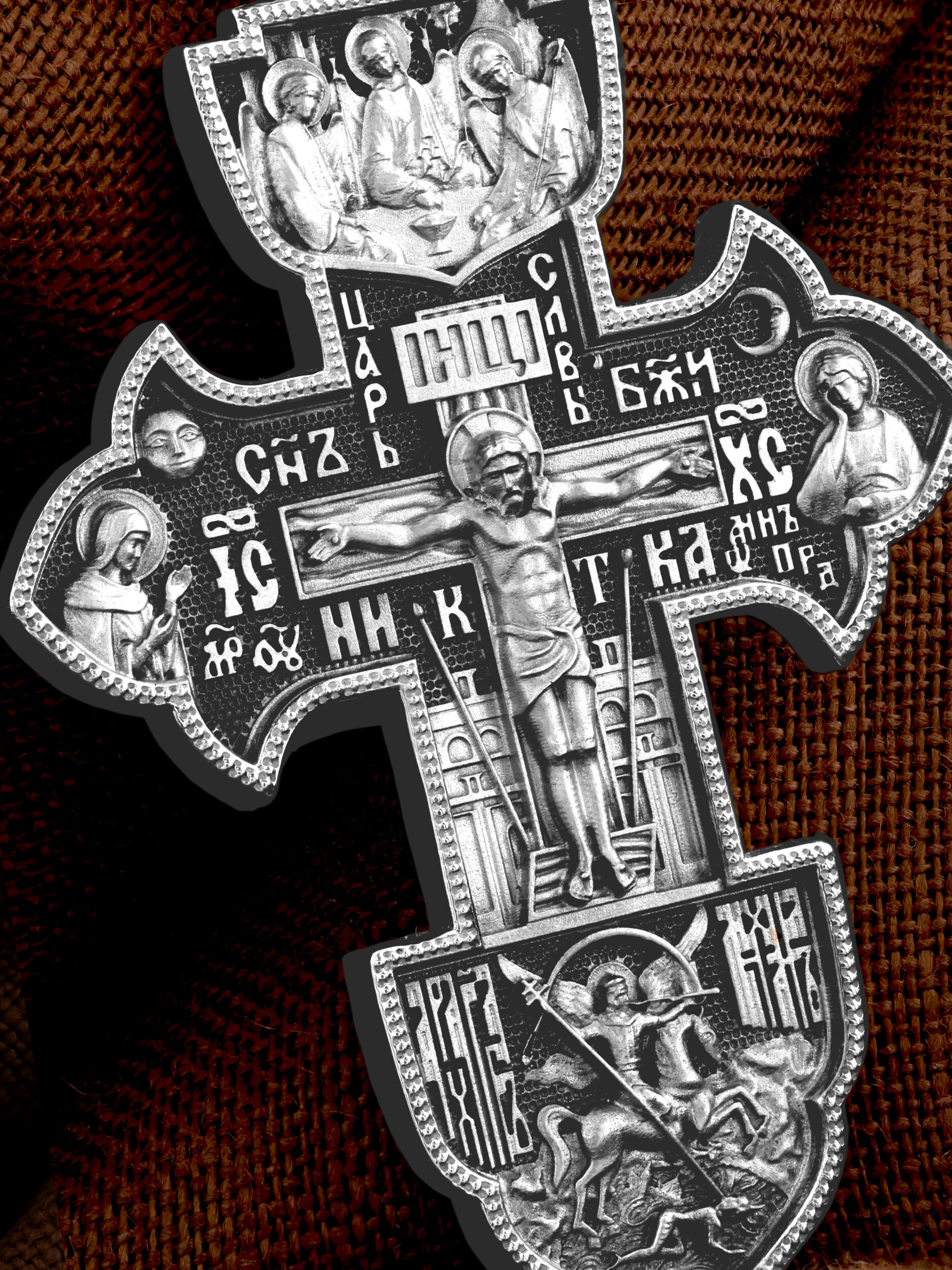 На лицевой стороне креста изображено Распятие Господа и Спасителя нашего Иисуса Христа. Крест- символ спасения и искупления рода человеческого, знамение победы над смертью и адом. Иисус Христос, как искупительная жертва освобождения человечества от власти греха, умер крестной смертью и в третий день воскрес. На верхней табличке, выше головы Иисуса, расположена надпись, составленная Понтием Пилатом — «IНЦI». Она означает «Иисус Назорей, Царь Иудейский». Распятие сопровождается каноническими надписями. Над Распятием находится надпись «Царь Славы». Надпись «IС» « ХС» означает Иисус Христос и помещается на разных сторонах поперечной (большой) перекладины креста. Рядом расположены надпись «Сын Божий» и слово «НИКА», что означает «победитель». Слева от Распятия изображена Пресвятая Богородица, справа — апостол и евангелист Иоанн Богослов, один из ближайших учеников Иисуса Христа. За Распятием высится Иерусалимская стена, в знак того, что Господь был распят вне стен города. Вдоль креста изображены копие сотника Лонгина и трость с губкой и буквы «К» и «Т». Рядом — слово «НИКА», что означает «победитель». Над распятием помещено изображение иконы Святой Троицы в виде трех ангелов. Ниже распятия изображен Архангел Михаил, восседающим на огненном крылатом коне. От уст архангела исходит труба, возвещающая наступление Второго пришествия и Страшного суда, а над его распростертыми крыльями изображена радуга. Копьем с крестом он пронзает поверженного сатану. На кулонном кольце изображен Нерукотворный образ Господа и Спасителя нашего Иисуса Христа, чудесно отпечатавшийся на плате, котором Христос вытер свой лик.