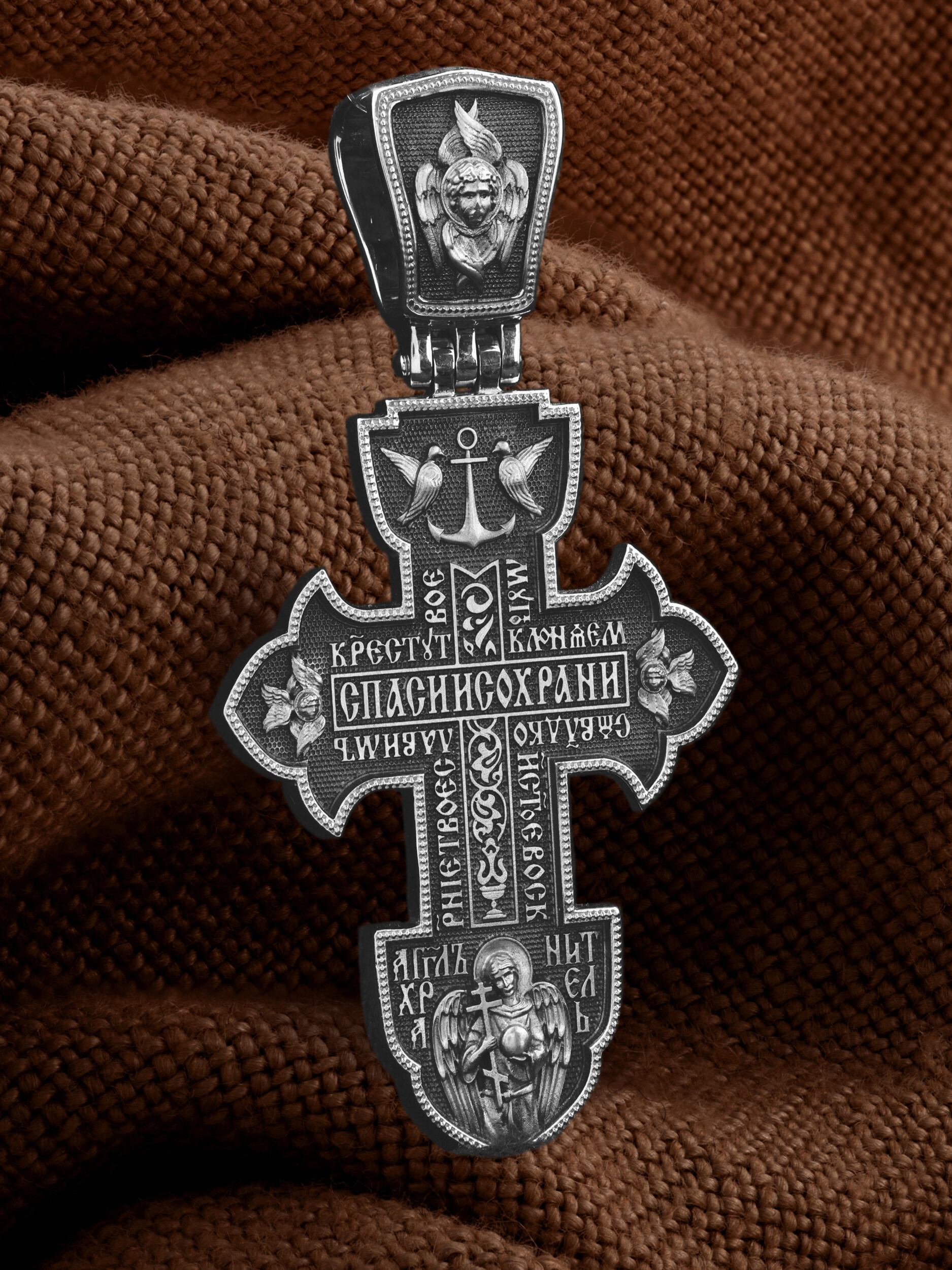 В центральной части оборотной стороны креста написана молитва: «Спаси и сохрани». Рядом — песнь: «Кресту Твоему поклоняемся, Владыко, и святое Воскресение Твое славим». Ниже изображен святой Ангел-Хранитель в виде прекрасного юноши держащего в правой руке крест, а в левой — сферу.. На кулонном кольце изображен Ангел Серафим.