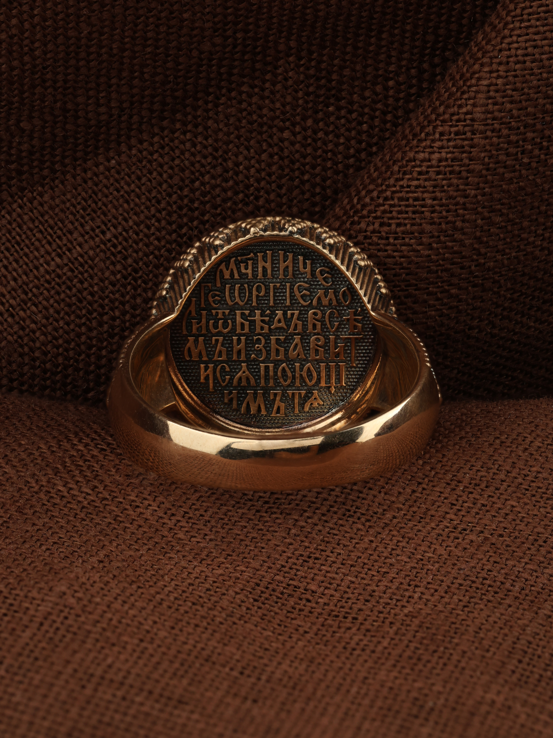 Кольцо «Святой Великомученик Георгий Победоносц» выполнено в древних христианских традициях. Основой композиции является изображение Святого Великомученика Георгия Победоносца — одного из самых почитаемых и удивительных святых. Георгий родился в Каппадокии (Малая Азия) в семье богатых и знатных горожан. Юношей поступил на службу к римскому императору Диоклетиану, за отличное знание военного дела и проявленную в боях и походах храбрость был приближен к императору и удостоен высокого воинского звания. Во время начавшихся гонений на христиан, перешел на сторону гонимых и, отвергнув человеческий страх, стал ярым проповедником учения Христа. Мучители подвергли опального воеводу жесточайшим восьмидневным пыткам и казнили его (обезглавили) в возрасте около тридцати лет в 303 году. На Руси он известен как Юрий или Егорий, заступник для верующих, чья жизнь имеет какое-либо отношение к военным делам, помощник в крестьянском труде. Георгий изображен как воитель, сидящий на вздыбленном коне и поражающий копьем огнедышащего змея. Справа над образом изображена благословляющая Божия десница. Змей символизирует собою сатанинские силы. Молитвами вознесенными к Всевышнему и своей непреклонной верой он смог одолеть чудовище. Святой убил змея, спас царскую дочь, принесенную в жертву, и жителей города, их души от влияния дьявола, породив в них надежду и веру в Господа, призывая людей принять христианскую веру.