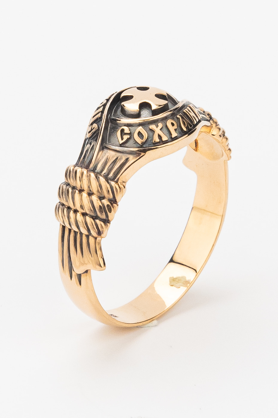 В центральной части лицевой стороны кольца изображен Крест. Господь сказал: кто хочет идти за Мною, отвергнись себя, и возьми крест свой, и следуй за Мною. Крест является символом жертвенной любви Всеблагого Бога к падшим людям, всепобеждающим духовным оружием христиан, основанием и средоточием церковной жизни. Иисус Христос, как искупительная жертва освобождения человечества от власти греха, умер крестной смертью и в третий день воскрес. Крест имеет четырехконечную форму с равными балками. Такого типа кресты существовали во многих дохристианских культурах и были в первую очередь использованы Церковью для выражения идеи христианского преобразования мира. Вокруг креста помещена молитва: «Спаси и Сохрани».