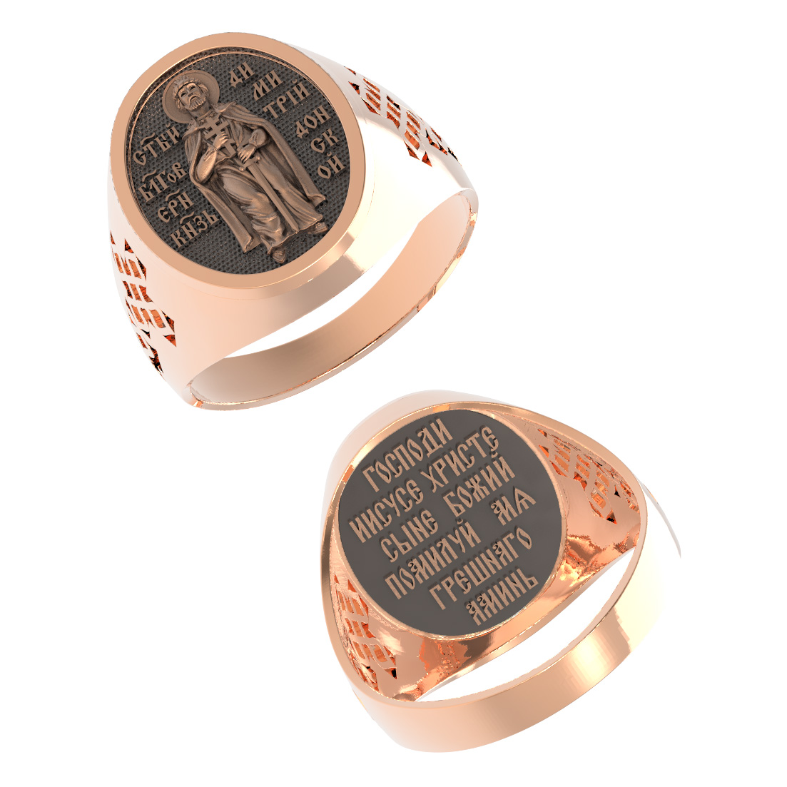 На оборотной стороне кольца отображена молитва Иисусова: «Господи, Иисусе Христе, Сыне Божий, помилуй мя, грешного. Аминь».