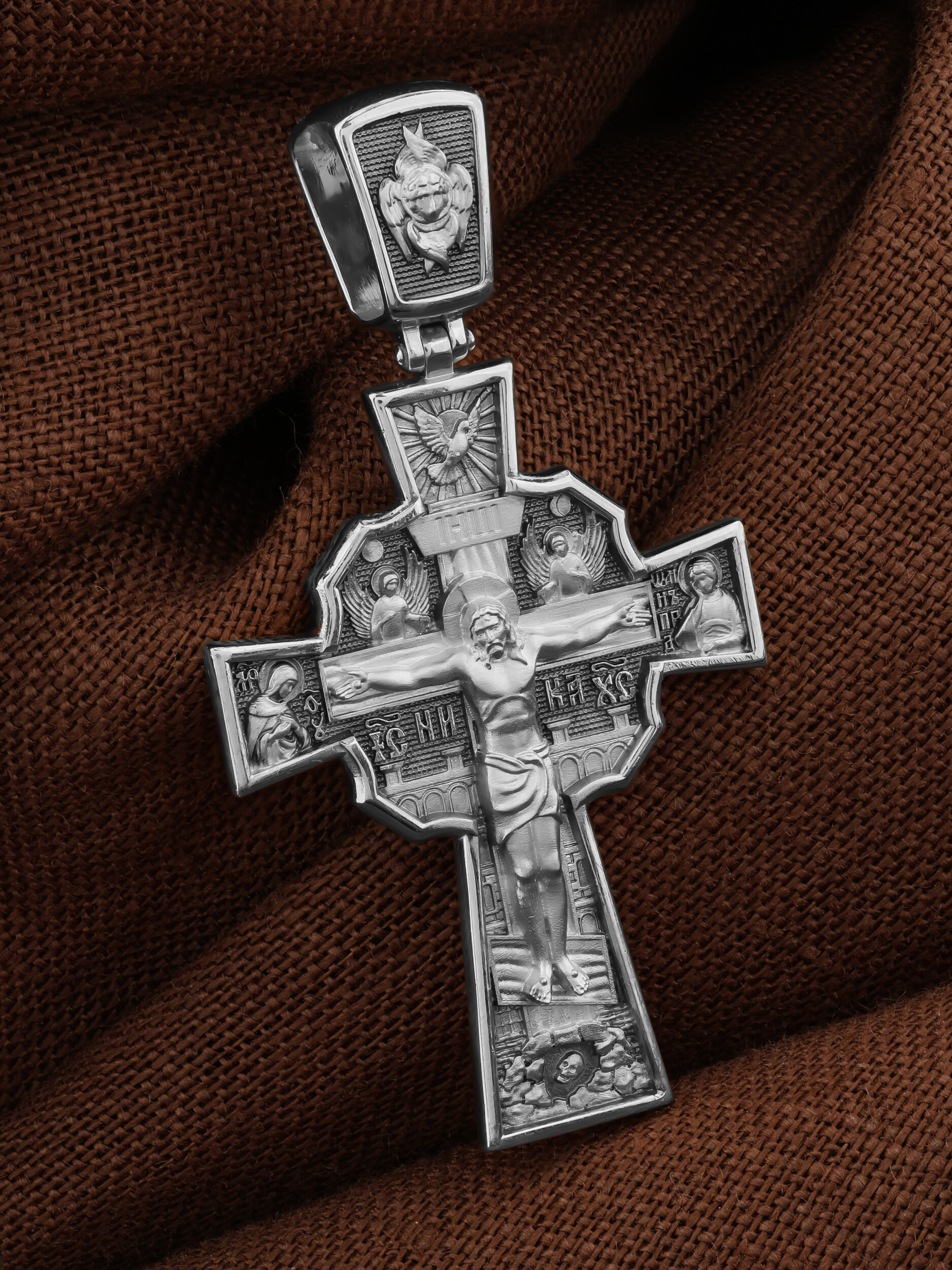 На лицевой стороне креста изображено Распятие Господа и Спасителя нашего Иисуса Христа, отдавшего Себя на смерть, для искупления грехов мира. Верхняя перекладина символизирует титло — табличку, на которой, согласно Евангелию, было начертано: Иисус Назорей Царь Иудейский (IНЦI). Распятие сопровождается надписями, олицетворяющими Христа. Надпись «IС» « ХС», что означает Иисус Христос, и слово «НИКА», что означает «победитель», помещаются ниже поперечной перекладины креста. Над вершиной Распятия помещено изображение Святого Духа, в виде голубя сходящего с небес, и двух Ангелов. Слева от Распятия изображена Пресвятая Богородица, справа — апостол и евангелист Иоанн Богослов, один из ближайших учеников Иисуса Христа. За крестом высится Иерусалимская стена, в знак того, что Господь был распят вне стен города. Возвышение, на котором стоит Крест, символизирует гору Голгофу, на которой произошло Распятие. Под подножием Креста изображена покоящаяся голова (череп) Адама. На кулонном кольце помещено изображение шестикрылого Серафим.