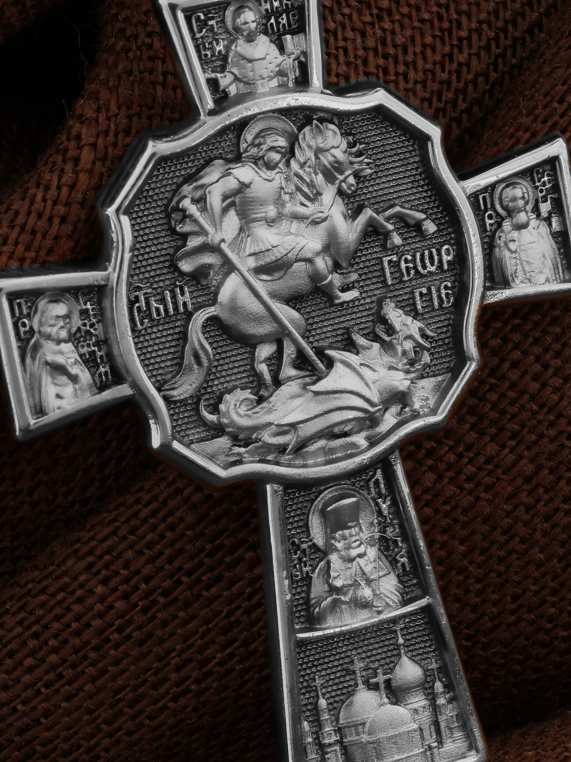 В центре оборотной стороне креста помещен образ Святого Великомученика Георгия Победоносца — одного из самых почитаемых и удивительных святых. На образке он изображен как воитель поражающий копьем огнедышащего змея. Змей символизирует собою сатанинские силы. Справа помещен образ Святого Преподобного Сергия, игумена Радонежского, чудотворца, слева — Преподобного Серафима Саровского, чудотвореца. Выше помещен образ Святителя Николая архиепископа Мир Ликийских, чудотвореца, ниже — образ святителя Луки (Войно-Ясенецкого), архиепископа Симферопольского и Крымского, исповедника и изображение Храма. На кулонном кольце изображен Спас Нерукотворный — образ Господа и Спасителя нашего Иисуса Христа, чудесно отпечатавшийся на плате, котором Христос вытер свой лик.