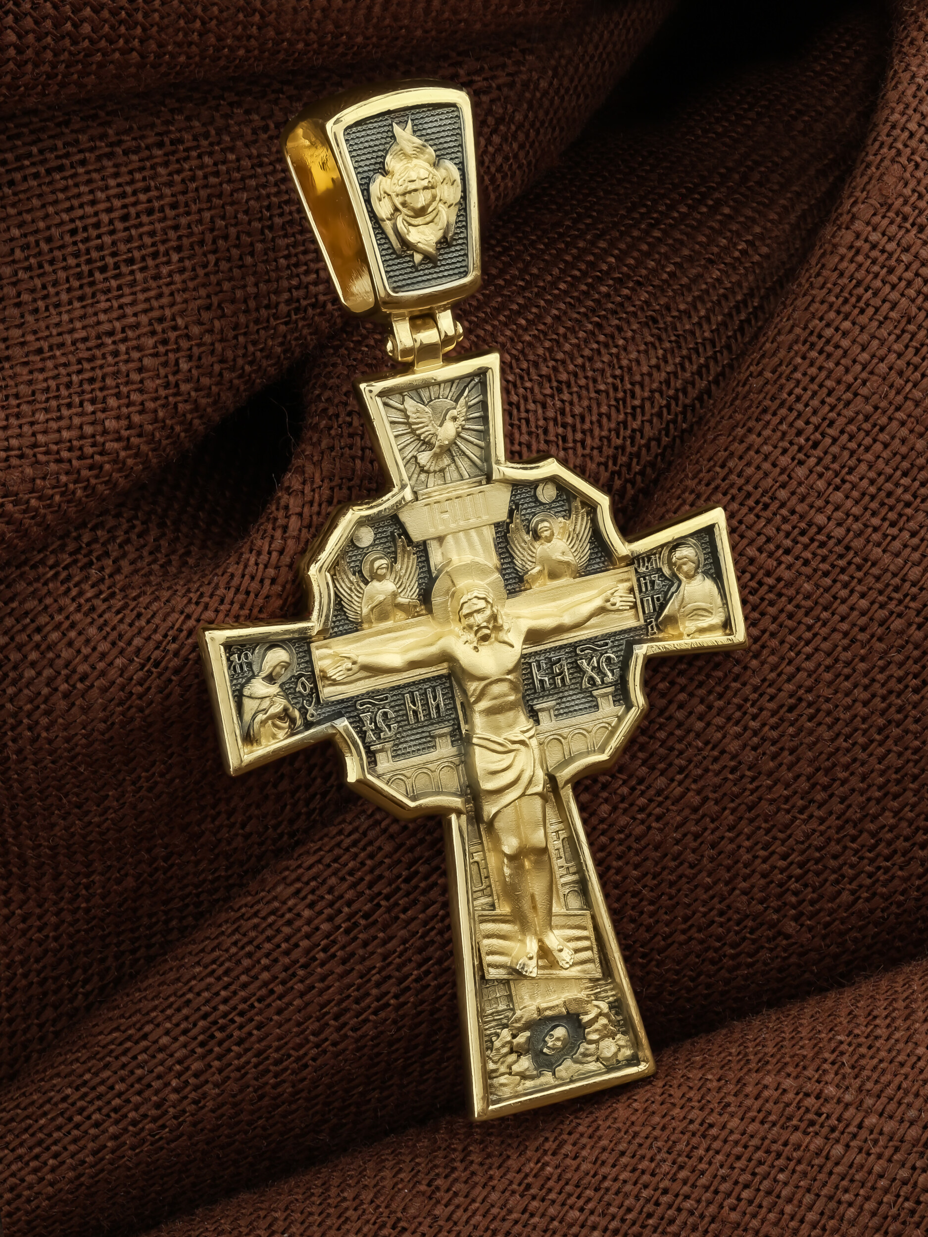 На лицевой стороне креста изображено Распятие Господа и Спасителя нашего Иисуса Христа, отдавшего Себя на смерть, для искупления грехов мира. Верхняя перекладина символизирует титло — табличку, на которой, согласно Евангелию, было начертано: Иисус Назорей Царь Иудейский (IНЦI). Распятие сопровождается надписями, олицетворяющими Христа. Надпись «IС» « ХС», что означает Иисус Христос, и слово «НИКА», что означает «победитель», помещаются ниже поперечной перекладины креста. Над вершиной Распятия помещено изображение Святого Духа, в виде голубя сходящего с небес, и двух Ангелов. Слева от Распятия изображена Пресвятая Богородица, справа — апостол и евангелист Иоанн Богослов, один из ближайших учеников Иисуса Христа. За крестом высится Иерусалимская стена, в знак того, что Господь был распят вне стен города. Возвышение, на котором стоит Крест, символизирует гору Голгофу, на которой произошло Распятие. Под подножием Креста изображена покоящаяся голова (череп) Адама. На кулонном кольце помещено изображение шестикрылого Серафим.