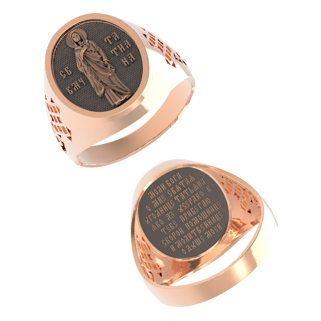 На лицевой стороне кольца помещен образ святой мученицы Татианы. Она родилась в Риме в семье знатного сановника, тайного христианина, воспитавшего дочь в благочестии и вере. Достигнув брачного возраста, святая Татиана не пожелала выйти замуж, а решила посвятить себя всецело служению Церкви. Она была поставлена диаконисой в одном из римских храмов и все свои силы отдавала исполнению церковных обязанностей. Вступивший на императорский престол шестнадцатилетний Александр Север (222 — 235) не был гонителем христиан, но в первые годы его царствования власть сосредоточилась в руках врага и гонителя христиан — Ульпиана. Святая Татиана была схвачена и приведена в капище Аполлона, где ее принуждали к принесению жертвы языческому идолу. Она отказалась и была подвергнута пыткам. В мученичестве святой Татианы Господь показал Свою безграничную мощь: по ее молитве трижды разрушались статуи языческих богов или как бы сами собой, или по видимым естественным причинам, сопровождаемые землетрясением, громом и молниями. Зверские мучения, которым подвергали святую Татиану, или не причиняли ей вреда, или за ночь следы их бесследно исчезали, или сами мучители страдали от ударов, наносимых невидимой рукой. Голодный лев, выпущенный на святую Татиану на арене цирка, не причинил ей ни малейшего вреда. Знамения силы и истины Господней, явленные в мученичестве святой Татианы, многих привели к вере во Христа. Уставшие судьи прекратили жизнь святой мученицы Татианы ударом меча; вместе с нею казнили и ее отца (+226).