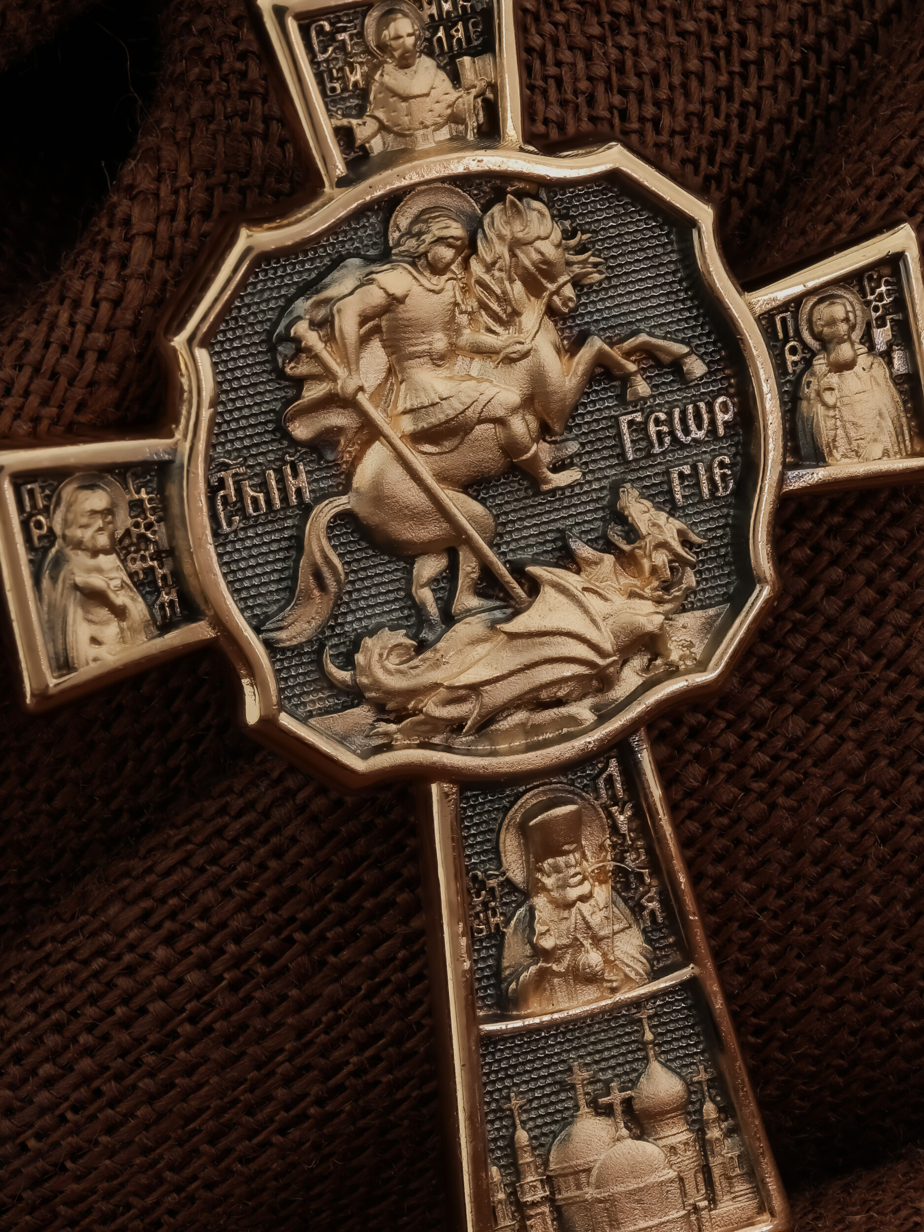 В центре оборотной стороне креста помещен образ Святого Великомученика Георгия Победоносца — одного из самых почитаемых и удивительных святых. На образке он изображен как воитель поражающий копьем огнедышащего змея. Змей символизирует собою сатанинские силы. Справа помещен образ Святого Преподобного Сергия, игумена Радонежского, чудотворца, слева — Преподобного Серафима Саровского, чудотвореца. Выше помещен образ Святителя Николая архиепископа Мир Ликийских, чудотвореца, ниже — образ святителя Луки (Войно-Ясенецкого), архиепископа Симферопольского и Крымского, исповедника и изображение Храма. На кулонном кольце изображен Спас Нерукотворный — образ Господа и Спасителя нашего Иисуса Христа, чудесно отпечатавшийся на плате, котором Христос вытер свой лик.