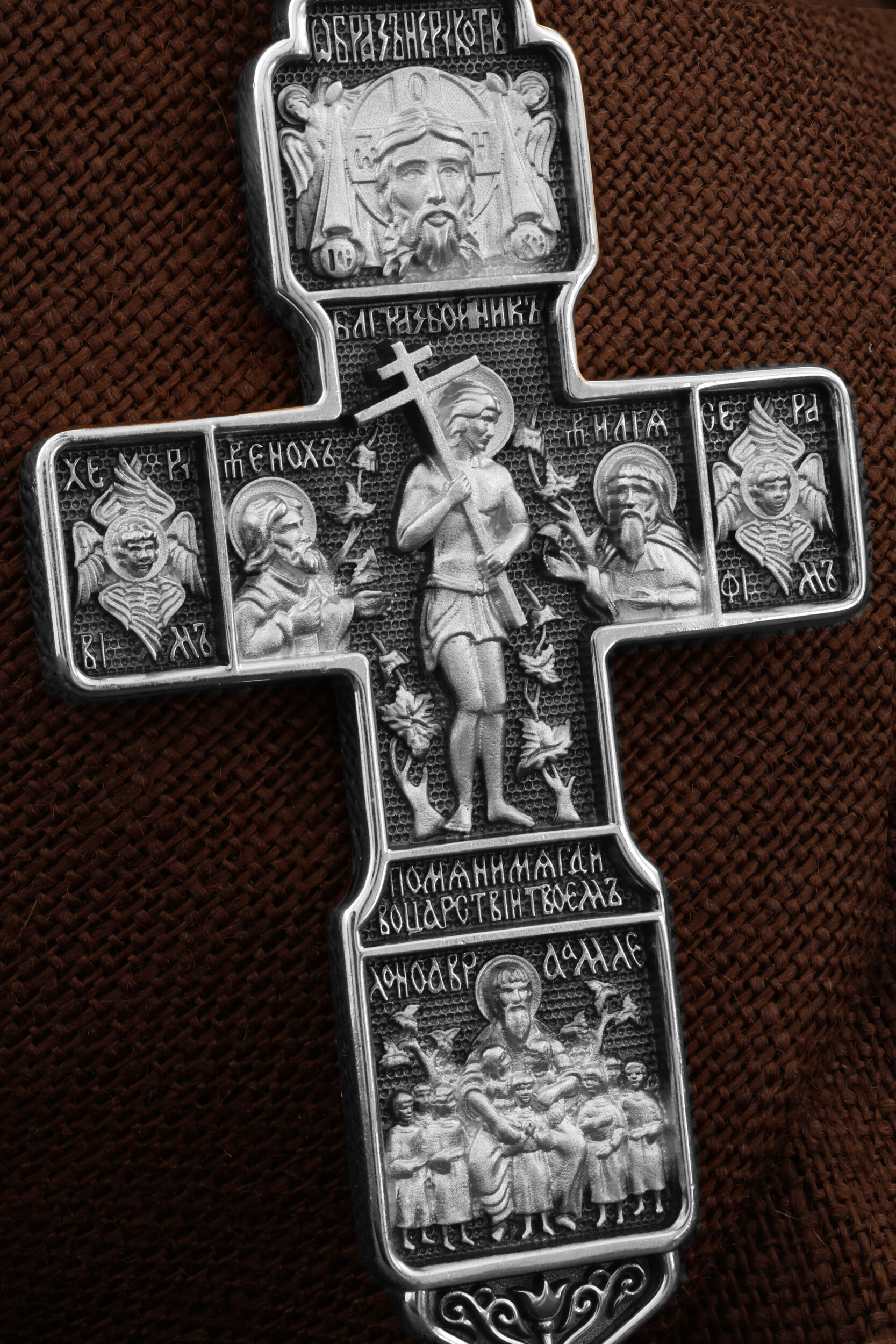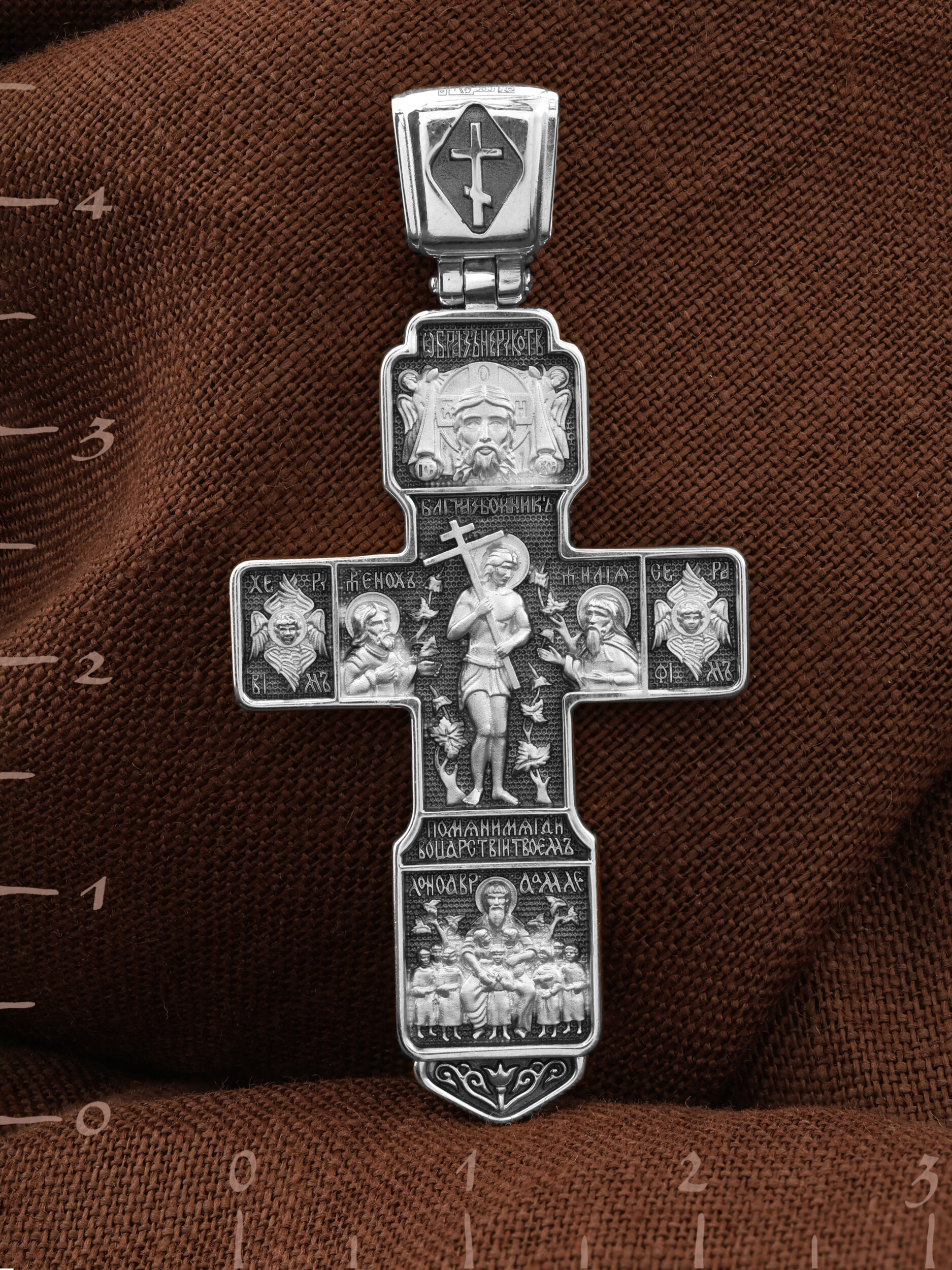 На концах горизонтальной балки креста помещены образы вселенских святителей и творцов литургии Василия Великого и Иоанна Златоуста. В кулонном кольце изображены райские врата с их стражем — Херувимом. Врата, которые открылись благодаря крестной жертве Христа.