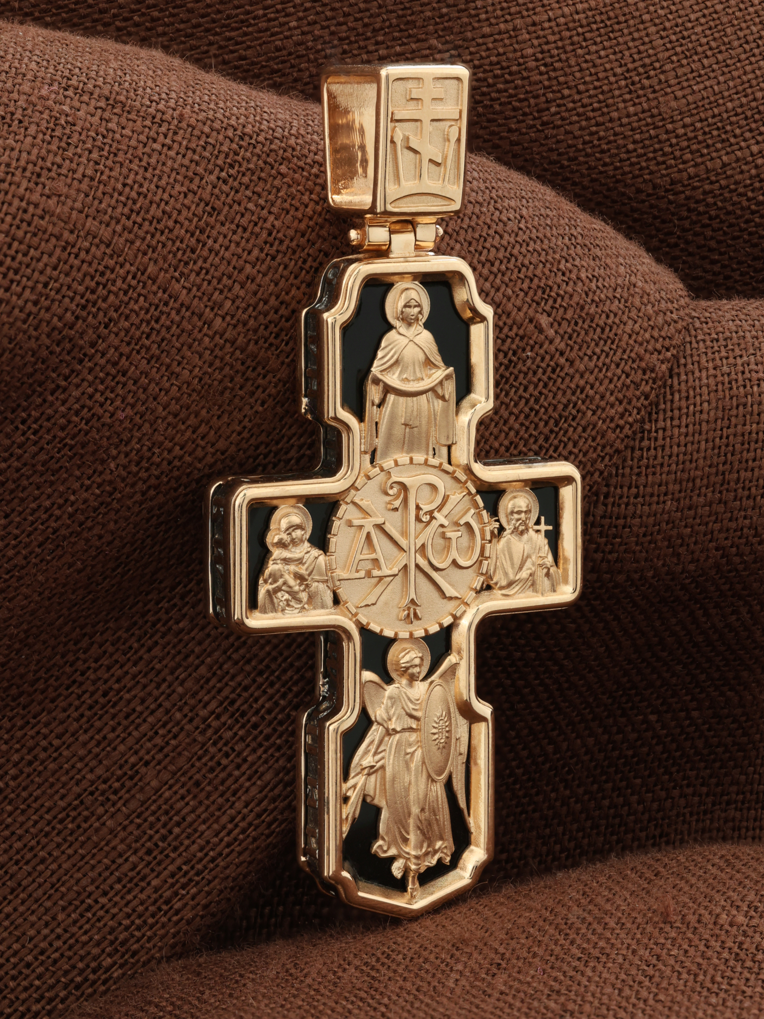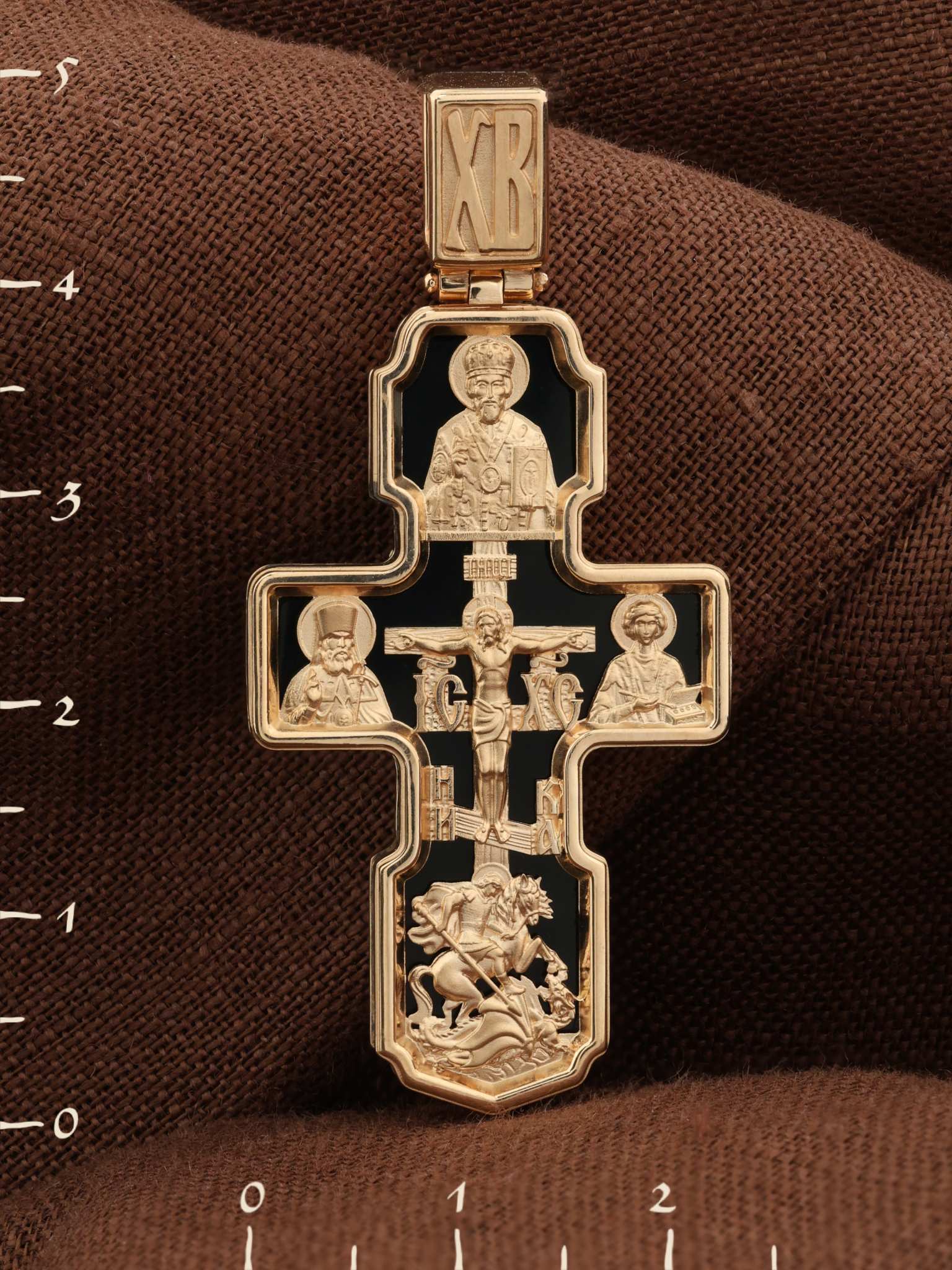 На лицевой стороне креста изображено Распятие Господа и Спасителя нашего Иисуса Христа. Христос, подвергнутый на кресте мучительной казни, своими страданиями искупил нас от древнего греха и даровал нам жизнь вечную. Без Распятия не было бы Воскресения Христова, и поэтому Крест из орудия казни обратился в святыню, в которой действует Благодать Божия. На верхней табличке, выше головы Иисуса, расположена надпись, составленная Понтием Пилатом на трех языках — «IНЦI». Она означает «Иисус Назорей, Царь Иудейский». Надпись «IС ХС» означает Иисус Христос и помещается на разных сторонах поперечной (большой) перекладины креста. На нижней перекладине находится надпись –«НИКА», что означает победитель. Над Распятием размещен образ Святителя Николая Чудотвореца, архиепископа Мир Ликийских. Ниже Распятия — образ Святого Великомученика Георгия Победоносца. Он изображен как воитель, сидящий на вздыбленном коне и поражающий копьем огнедышащего змея. Слева — образ Святителя Луки (Войно-Ясенецкого), а справа — образ Святого великомученика и целителя Пантелеимона. На кулонном кольце находится надпись «ХВ», что означает Христос Воскрес.