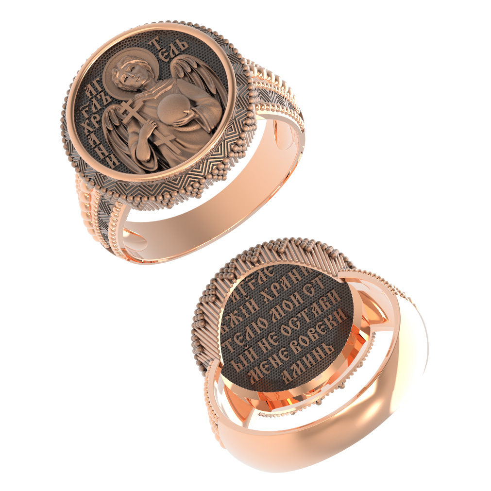 Кольцо «Святой Ангел-Хранитель " выполнено в древних христианских традициях. Ангел-Хранитель — это Ангел приставляемый Богом к человеку при крещении для охраны и помощи в добрых делах. Он невидимо находится при человеке на протяжении всей его жизни, если человек сохраняет в себе любовь к Богу и истинную веру перед Ним. Ангел-Xранитель делают для нас все, что служит к истинному нашему благу и спасению. Невидимо пребывая при нас постоянно, он, руководствуя нас ко спасению, не только по нашему желанию таинственно наставляет нас на все доброе и полезное, не только возносит наши молитвы к Богу, но еще и сам от себя охраняют и защищают нас от врагов видимых и невидимых и ходатайствует за нас пред Богом. Ангел-Хранитель так любит нас, как никто на земле любить не может. Ангел-Хранитель — присный друг наш, незримый тихий собеседник, пресладостный утешитель. Одного лишь каждому из нас он желает — спасения души; к этому он направляет все свои заботы. И если видит нас также заботящимися о спасении, радуется, если же видит нас пребывающими в нерадении о душе своей, скорбит.