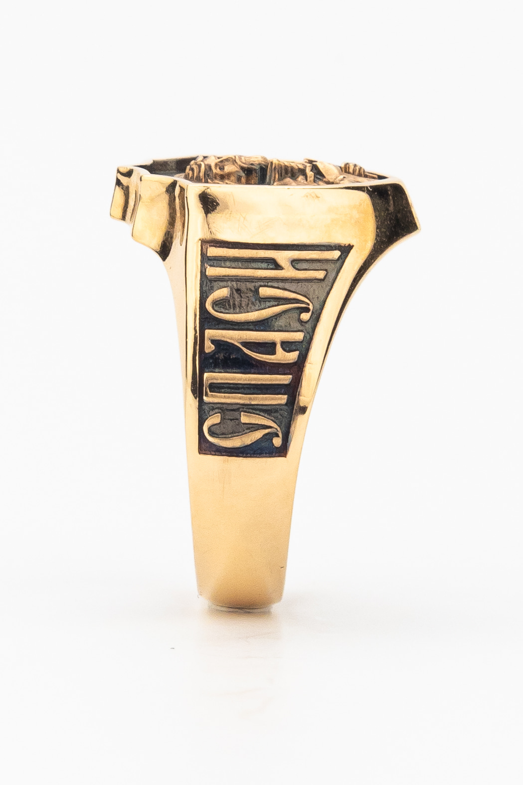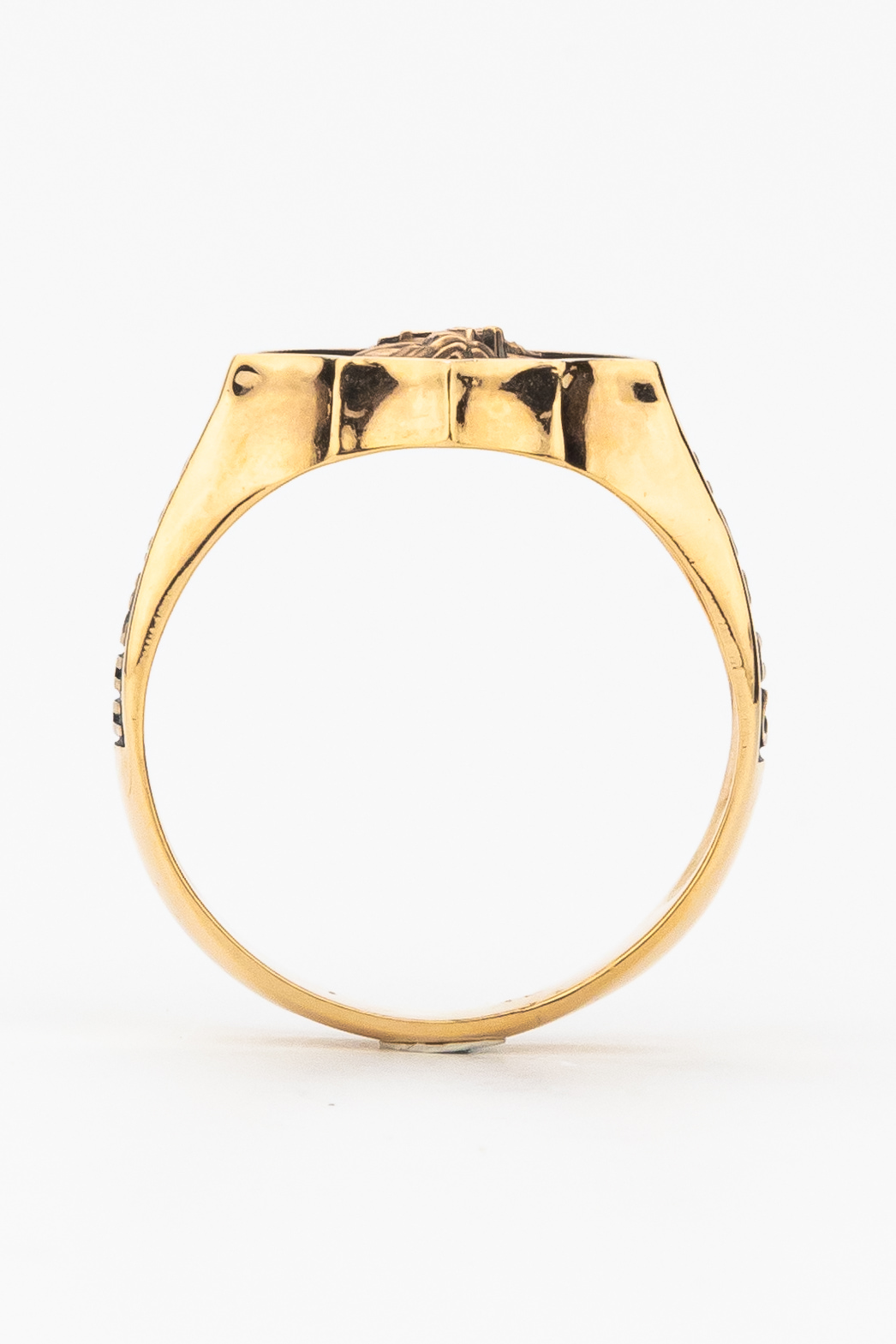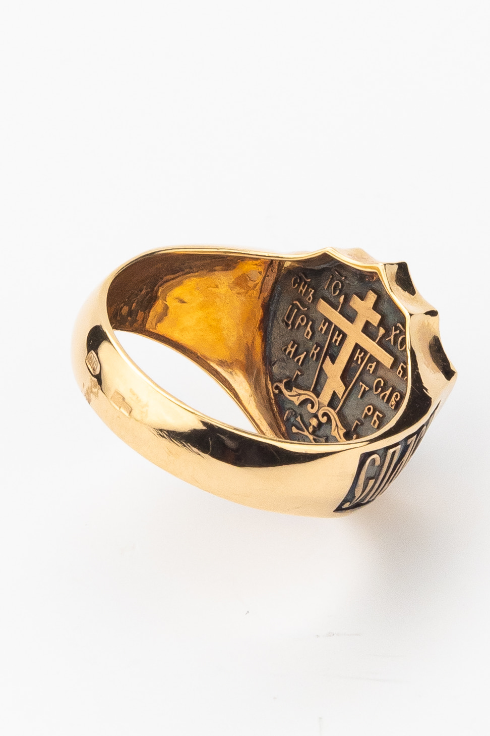 С внутренней стороны кольца изображен «Голгофский крест». Центральным и главным элементом композиции лицевой стороны является восьмиконечный крест — образ Честного и Животворящего Креста Господня, установленного на горе Голгофе. В основании креста изображена гора Голгофа, на которой был распят Спаситель и череп Адама, чьи кости по приданию омыла кровь Иисуса Христа. Перед головой располагаются лежащие кости рук, изображаются правая на левой, как при погребении или причащении. В XVI веке на Руси около изображения Голгофы появились обозначения «М.Л.Р.Б.» — Место Лобное Рай Бысть (Голгофа в переводе с еврейского — Лобное место). Чуть ниже справа и слева буквы «Г.Г.» — гора Голгофа.
