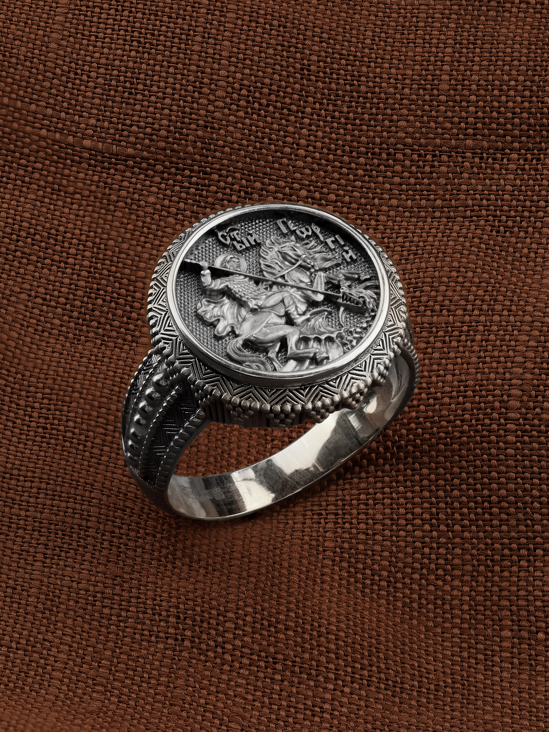 Кольцо «Святой Великомученик Георгий Победоносц» выполнено в древних христианских традициях. Основой композиции является изображение Святого Великомученика Георгия Победоносца — одного из самых почитаемых и удивительных святых. Георгий родился в Каппадокии (Малая Азия) в семье богатых и знатных горожан. Юношей поступил на службу к римскому императору Диоклетиану, за отличное знание военного дела и проявленную в боях и походах храбрость был приближен к императору и удостоен высокого воинского звания. Во время начавшихся гонений на христиан, перешел на сторону гонимых и, отвергнув человеческий страх, стал ярым проповедником учения Христа. Мучители подвергли опального воеводу жесточайшим восьмидневным пыткам и казнили его (обезглавили) в возрасте около тридцати лет в 303 году. На Руси он известен как Юрий или Егорий, заступник для верующих, чья жизнь имеет какое-либо отношение к военным делам, помощник в крестьянском труде. Георгий изображен как воитель, сидящий на вздыбленном коне и поражающий копьем огнедышащего змея. Справа над образом изображена благословляющая Божия десница. Змей символизирует собою сатанинские силы. Молитвами вознесенными к Всевышнему и своей непреклонной верой он смог одолеть чудовище. Святой убил змея, спас царскую дочь, принесенную в жертву, и жителей города, их души от влияния дьявола, породив в них надежду и веру в Господа, призывая людей принять христианскую веру.