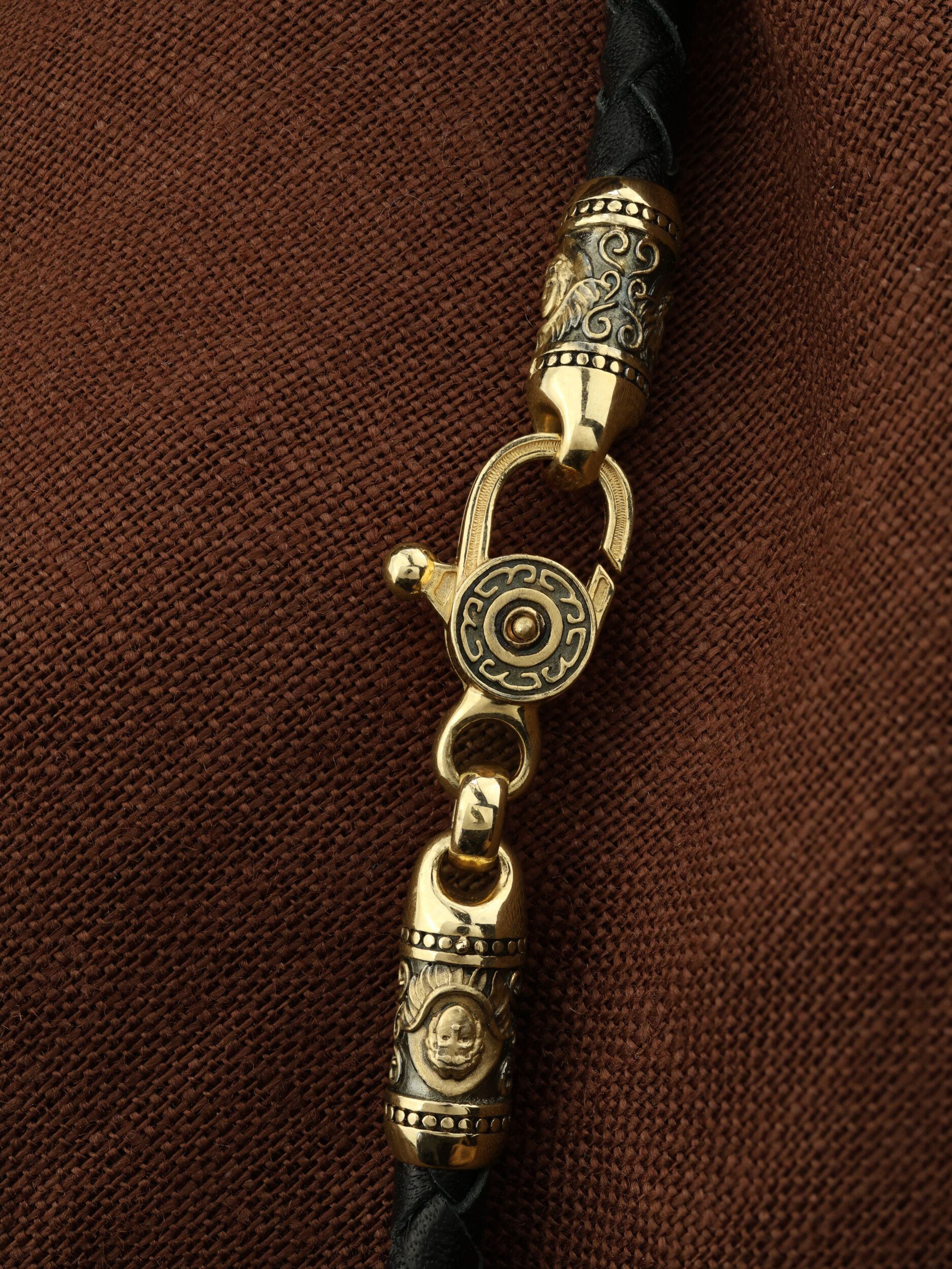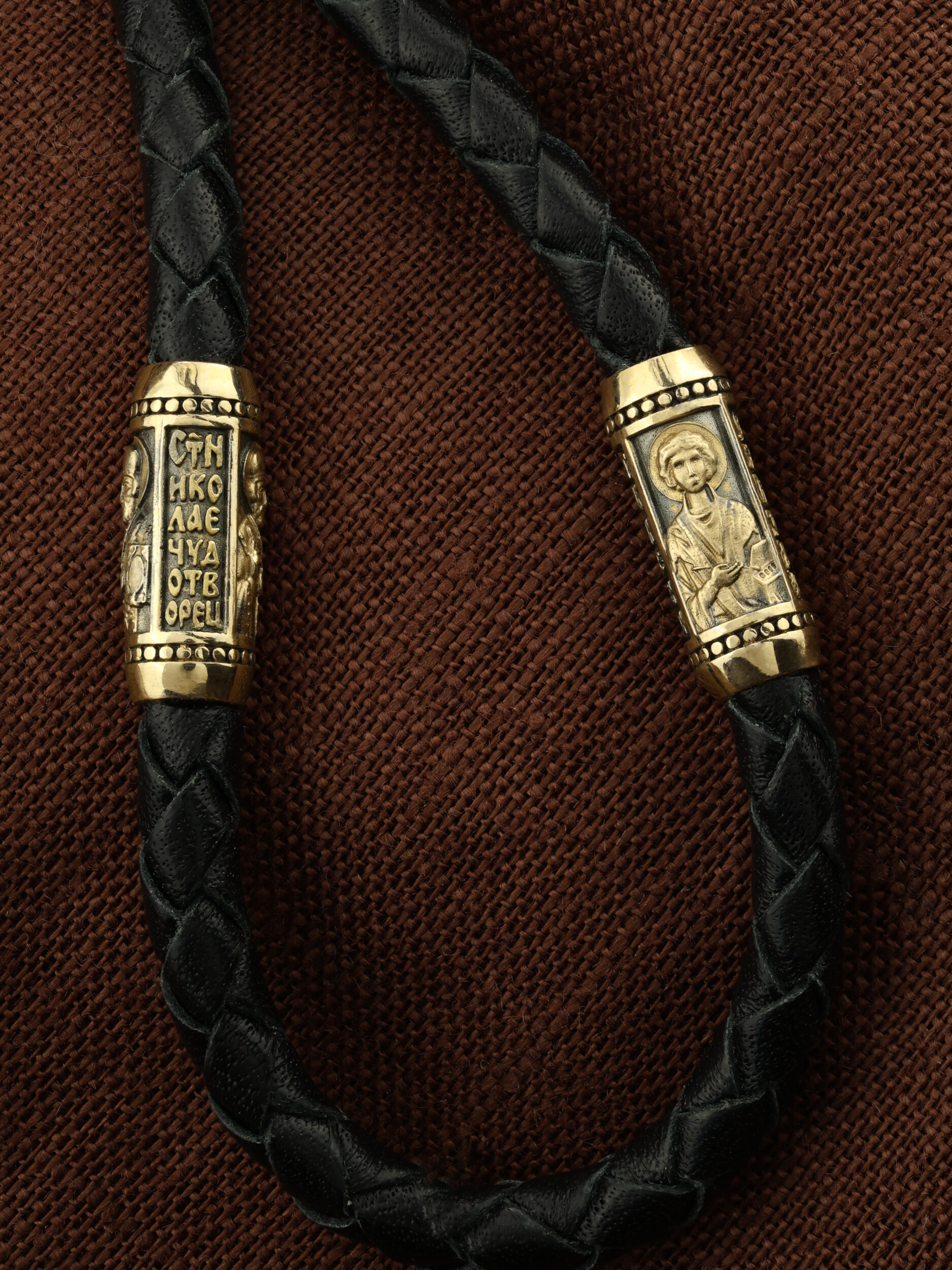 Гайтан из лимонного золота c кожаным шнурком и ониксом