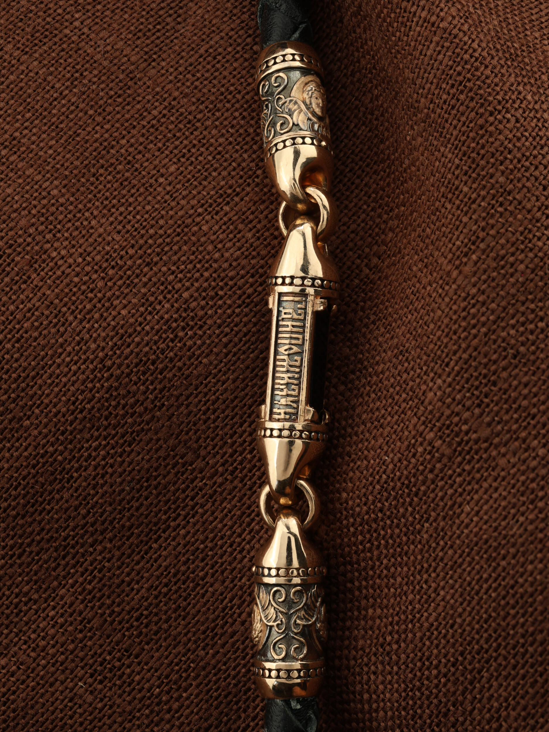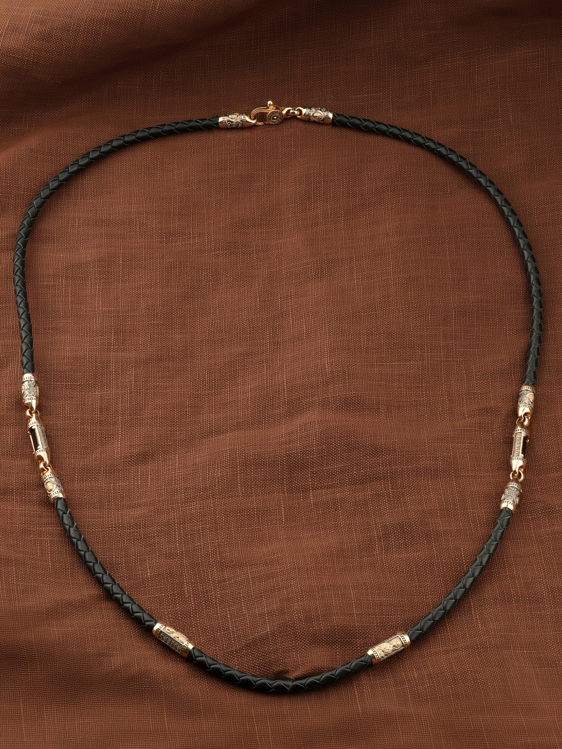 Гайтан из золота c кожаным шнурком и ониксом