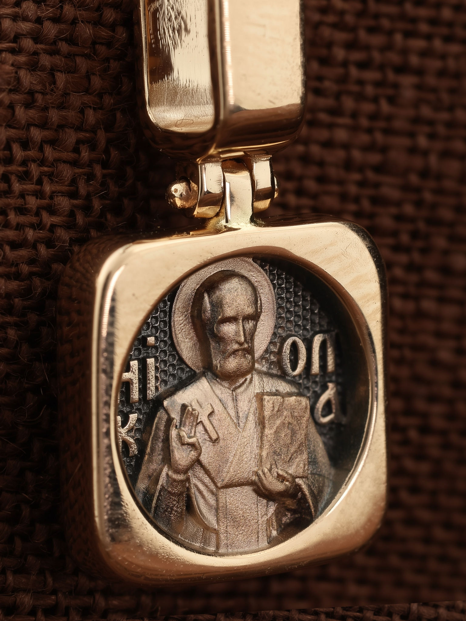 На лицевой стороне образка изображен Святитель Николай архиепископ Мир Ликийских, Чудотворец. Он является одним из самых почитаемых святых в православном мире. Святитель Николай родился во второй половине III века в Малой Азии в Ликийском городе Патары. С рождения Божий Угодник проявлял необыкновенные дарования. Сохранилось Предание, что во время крещения он, никем не поддерживаемый, простоял в купели три часа. Приняв сан священника, святитель Николай стал проводить еще более строгую подвижническую жизнь. Избранник Божий Николай стал вершиной всех добродетелей, поднятой до райской высоты. С кем из величайших праведников не сравнялся он образом духовной красоты, кому из них не последовал в своих деяниях и чудотворениях? Вся жизнь святого Николая — это служение Богу. Много великих и преславных чудес сотворил великий Святитель Николай Угодник. Он помогал сущим в бедах, укрощал штормы, спасал от потопления и выносил на сушу из глубины морской, освобождал из плена и приносил освобожденных домой, избавлял от уз и темницы, защищал от посечения мечом, освобождал от смерти и подавал многим различные исцеления: слепым — прозрение, хромым — хождение, глухим — слух, немым — дар слова.