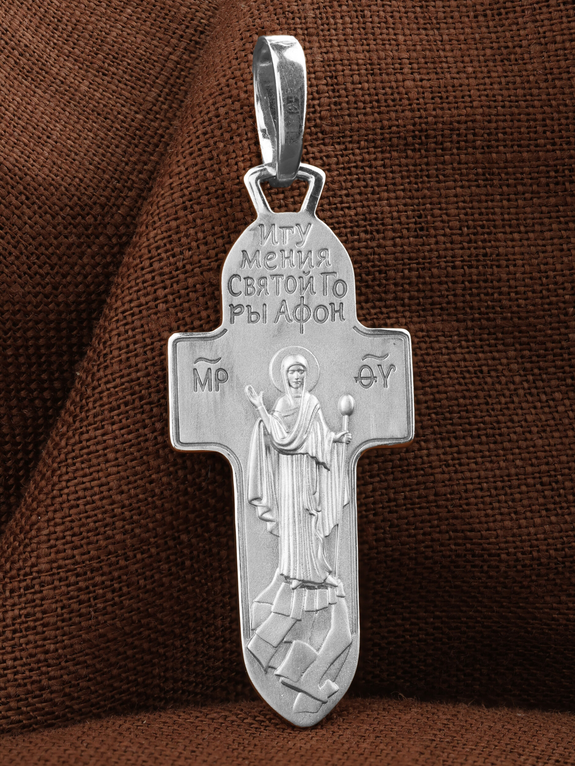 На оборотной стороне креста изображена Икона Божией Матери «Игумения Святой Горы Афонской». Икона написана греческим иконописцем афонского монастыря схимонахом Паисием. Богоматерь изображена с игуменским жезлом над всем монашеским островом. Святое предание связывает появление монашеских обителей на Святой Горе с особым попечительством Пресвятой Богородицы на Афоне. Божия Матерь возвестила евангельское учение жителям горы Афон, которые были язычниками. Народ слушал Ее проповеди, затем уверовал и крестился. Силой Своей проповеди и многочисленными чудесами Богородица обратила местных жителей в христианство. Она поставила там начальником и учителем одного из Апостольский мужей и сказала: «Сие место буди мне и жребий, данный мне от Сына Бога моего».