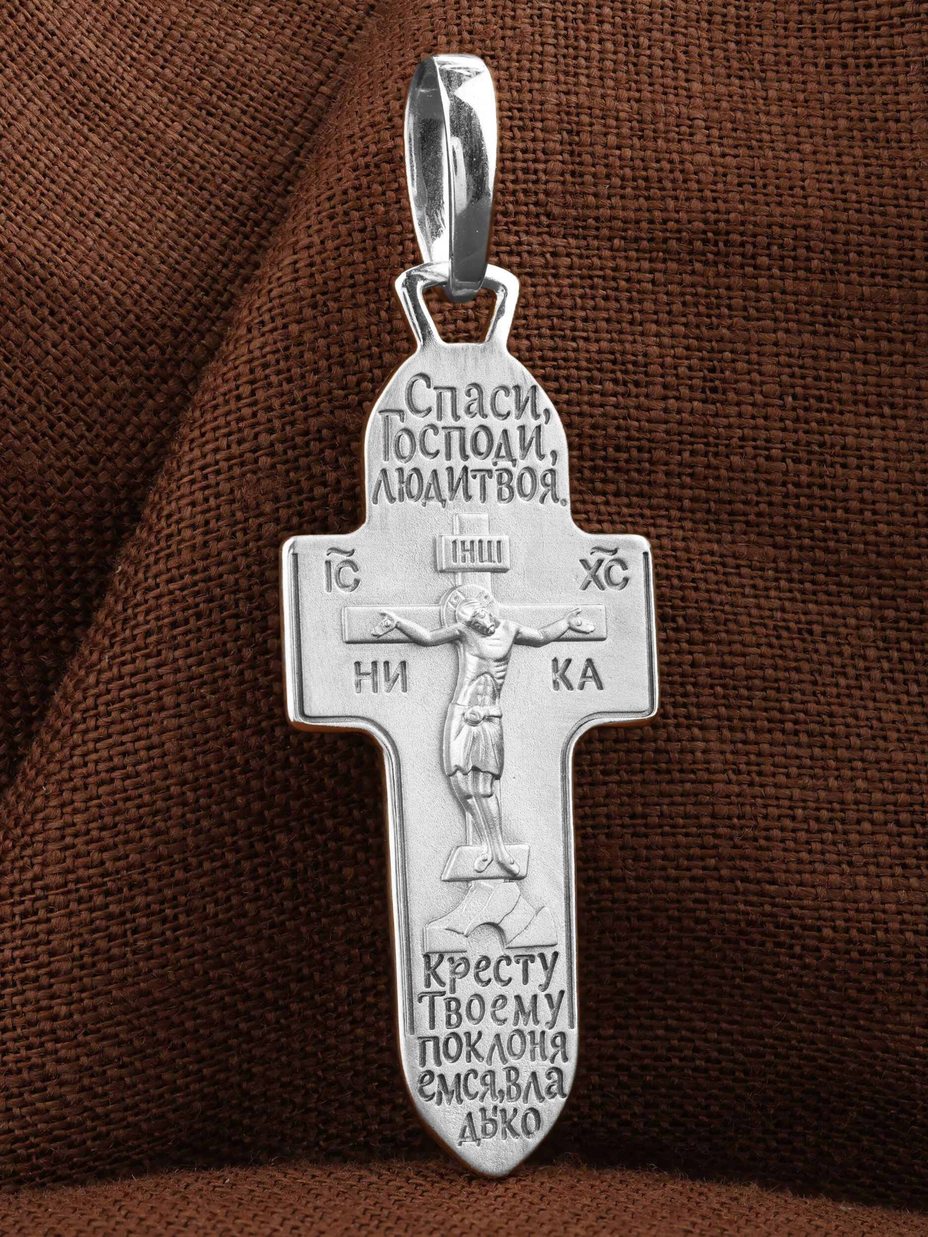 На лицевой стороне креста изображено Распятие Господа и Спасителя нашего Иисуса Христа. Крест- символ спасения и искупления рода человеческого, знамение победы над смертью и адом. Иисус Христос, как искупительная жертва освобождения человечества от власти греха, умер крестной смертью и в третий день воскрес. На верхней табличке, выше головы Иисуса, расположена надпись, составленная Понтием Пилатом — «IНЦI». Она означает «Иисус Назорей, Царь Иудейский». Надпись «IC» «ХC», означает Иисус Христос, помещается на разных сторонах поперечной перекладины креста. Под ней помещено слово «НIКА», что означает Победитель. Крест стоит на горе камней, символизирующих Голгофу.