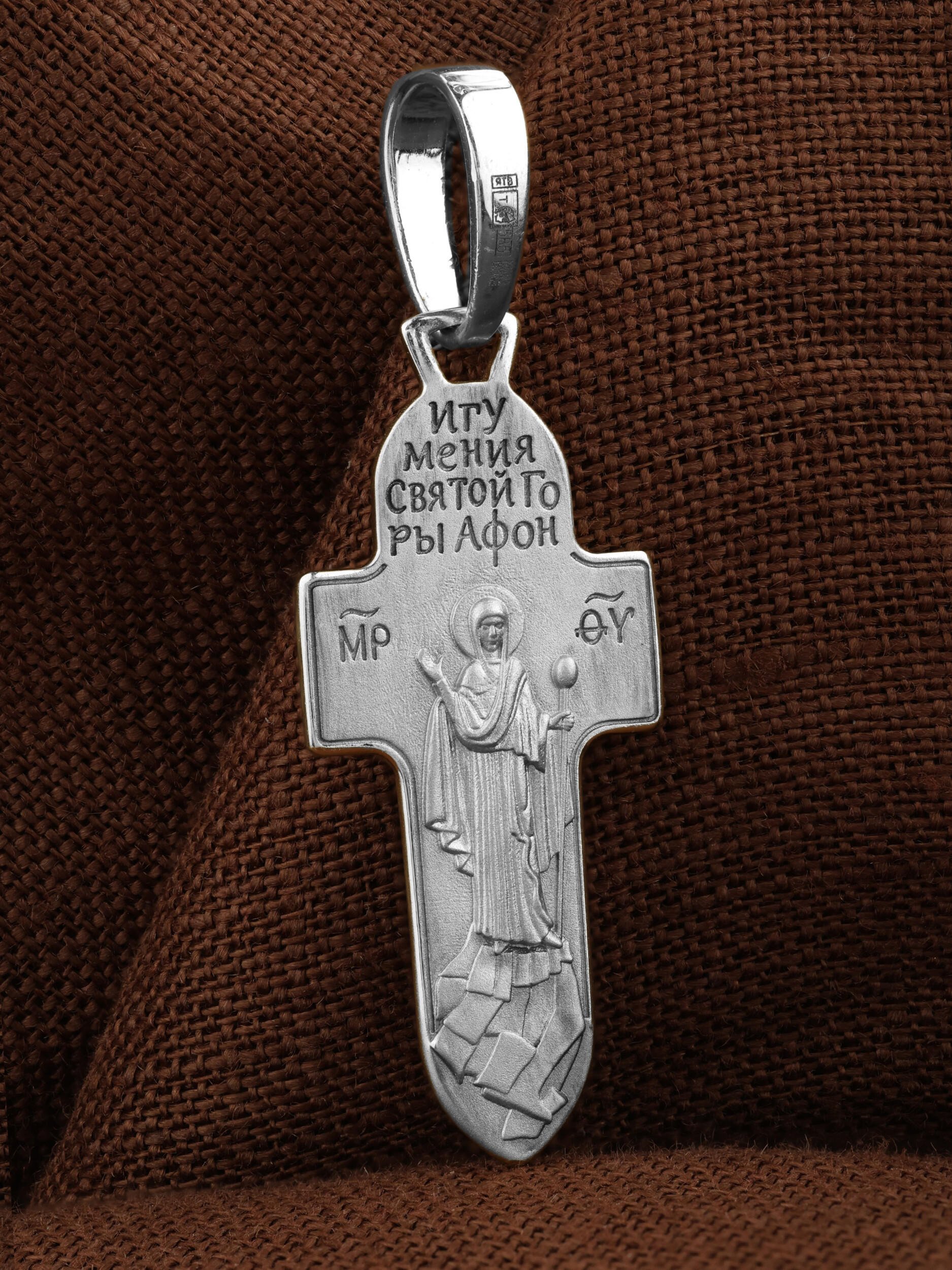 На оборотной стороне креста изображена Икона Божией Матери «Игумения Святой Горы Афонской». Икона написана греческим иконописцем афонского монастыря схимонахом Паисием. Богоматерь изображена с игуменским жезлом над всем монашеским островом. Святое предание связывает появление монашеских обителей на Святой Горе с особым попечительством Пресвятой Богородицы на Афоне. Божия Матерь возвестила евангельское учение жителям горы Афон, которые были язычниками. Народ слушал Ее проповеди, затем уверовал и крестился. Силой Своей проповеди и многочисленными чудесами Богородица обратила местных жителей в христианство. Она поставила там начальником и учителем одного из Апостольский мужей и сказала: «Сие место буди мне и жребий, данный мне от Сына Бога моего».