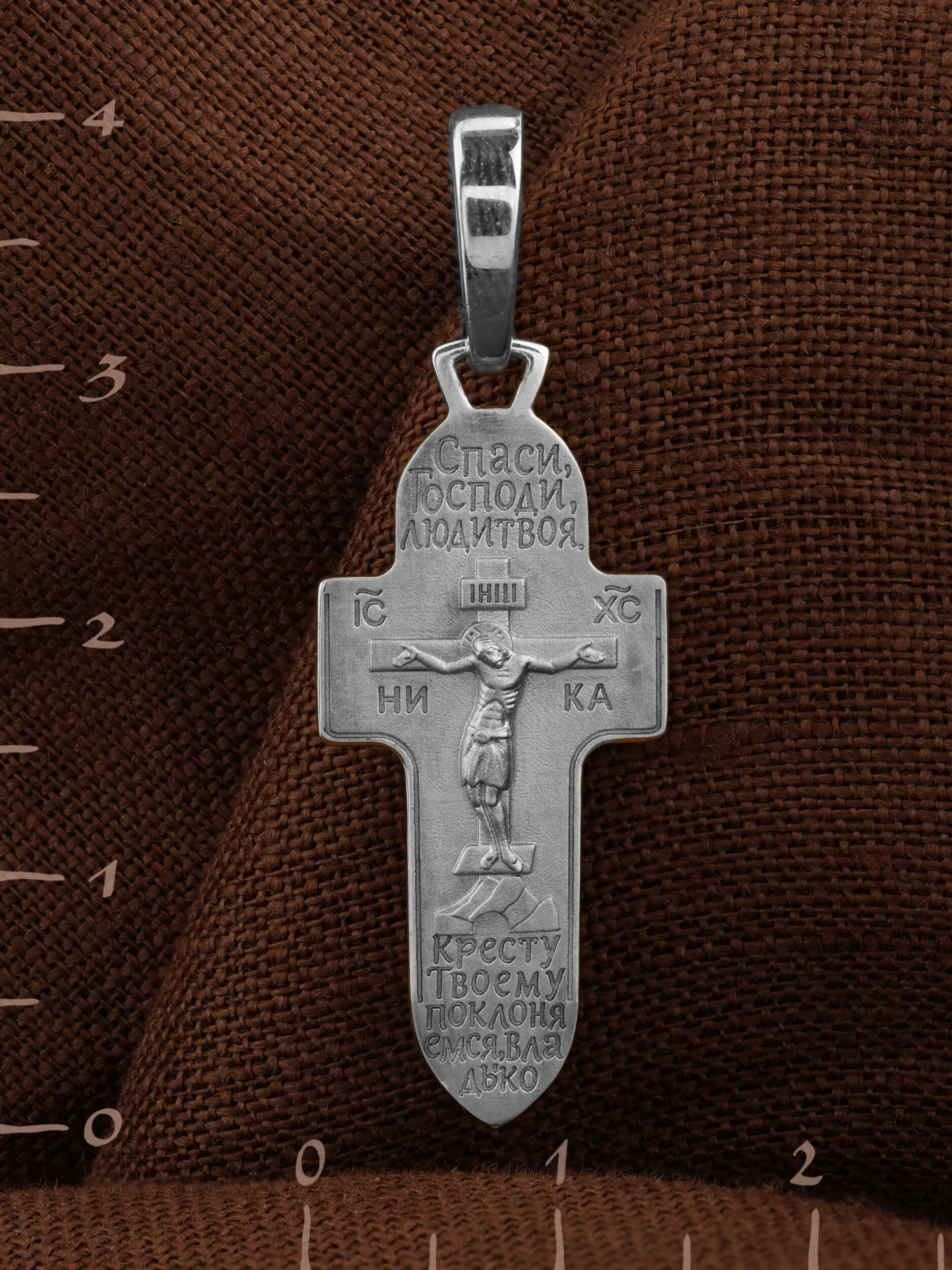 На лицевой стороне креста изображено Распятие Господа и Спасителя нашего Иисуса Христа. Крест- символ спасения и искупления рода человеческого, знамение победы над смертью и адом. Иисус Христос, как искупительная жертва освобождения человечества от власти греха, умер крестной смертью и в третий день воскрес. На верхней табличке, выше головы Иисуса, расположена надпись, составленная Понтием Пилатом — «IНЦI». Она означает «Иисус Назорей, Царь Иудейский». Надпись «IC» «ХC», означает Иисус Христос, помещается на разных сторонах поперечной перекладины креста. Под ней помещено слово «НIКА», что означает Победитель. Крест стоит на горе камней, символизирующих Голгофу.