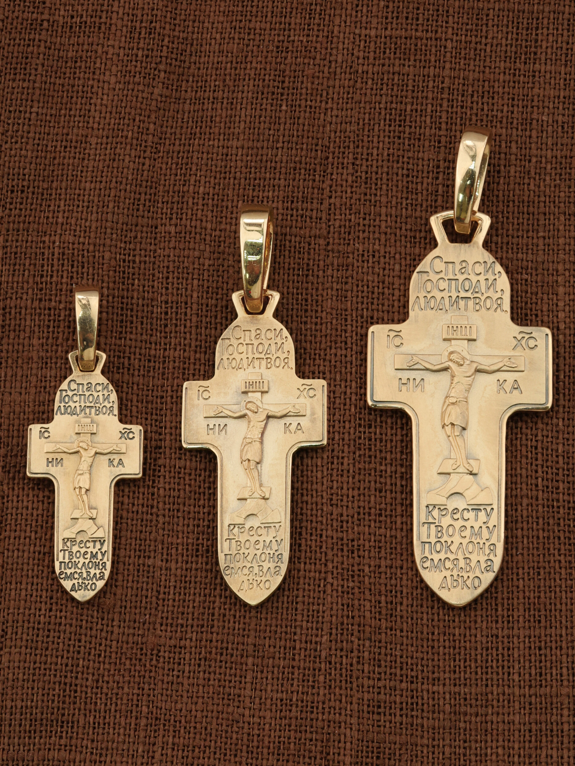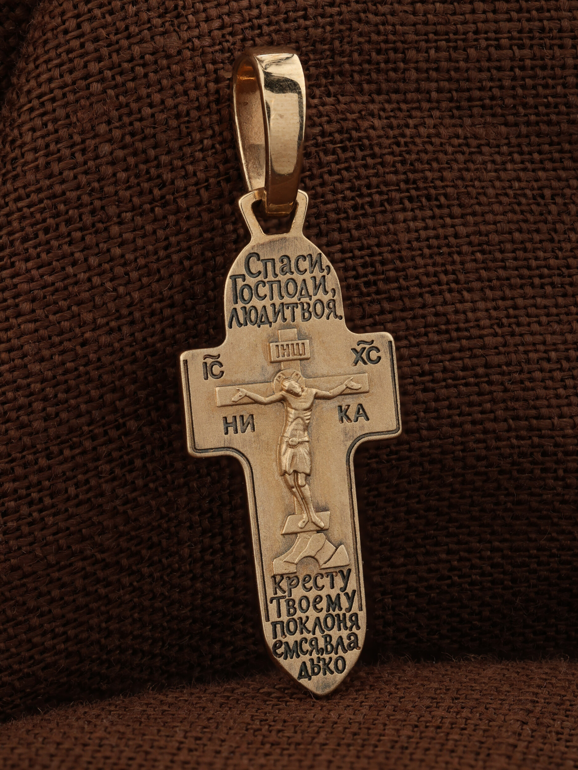 На лицевой стороне креста изображено Распятие Господа и Спасителя нашего Иисуса Христа. Крест- символ спасения и искупления рода человеческого, знамение победы над смертью и адом. Иисус Христос, как искупительная жертва освобождения человечества от власти греха, умер крестной смертью и в третий день воскрес. На верхней табличке, выше головы Иисуса, расположена надпись, составленная Понтием Пилатом — «IНЦI». Она означает «Иисус Назорей, Царь Иудейский». Надпись «IC» «ХC», означает Иисус Христос, помещается на разных сторонах поперечной перекладины креста. Под ней помещено слово «НIКА», что означает Победитель. Крест стоит на горе камней, символизирующих Голгофу.